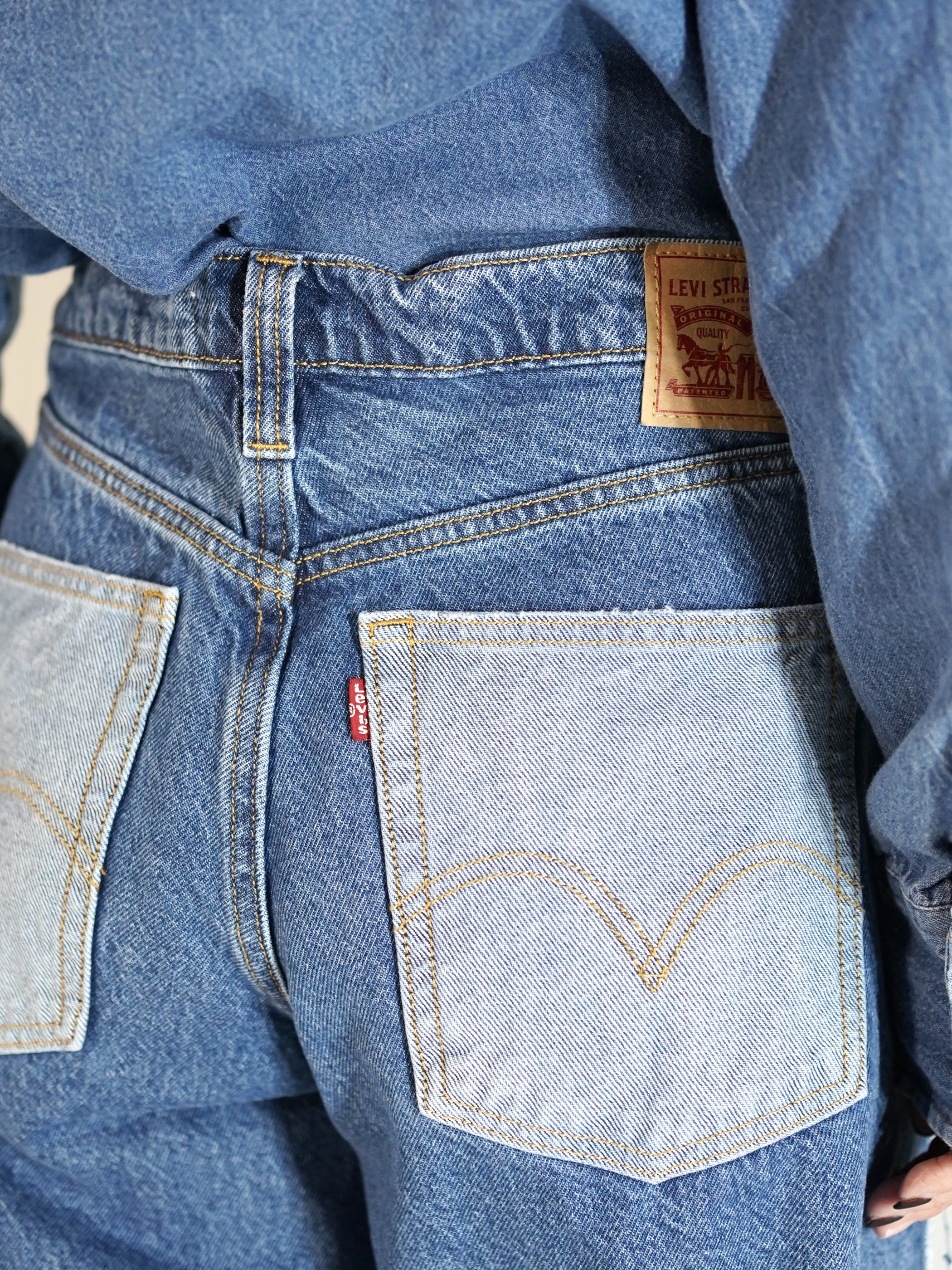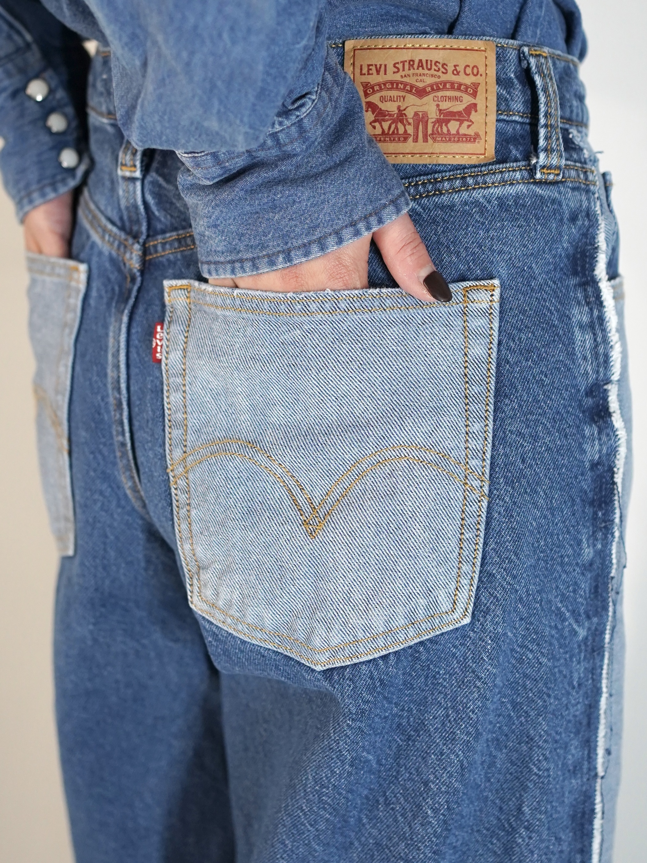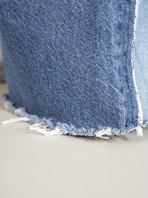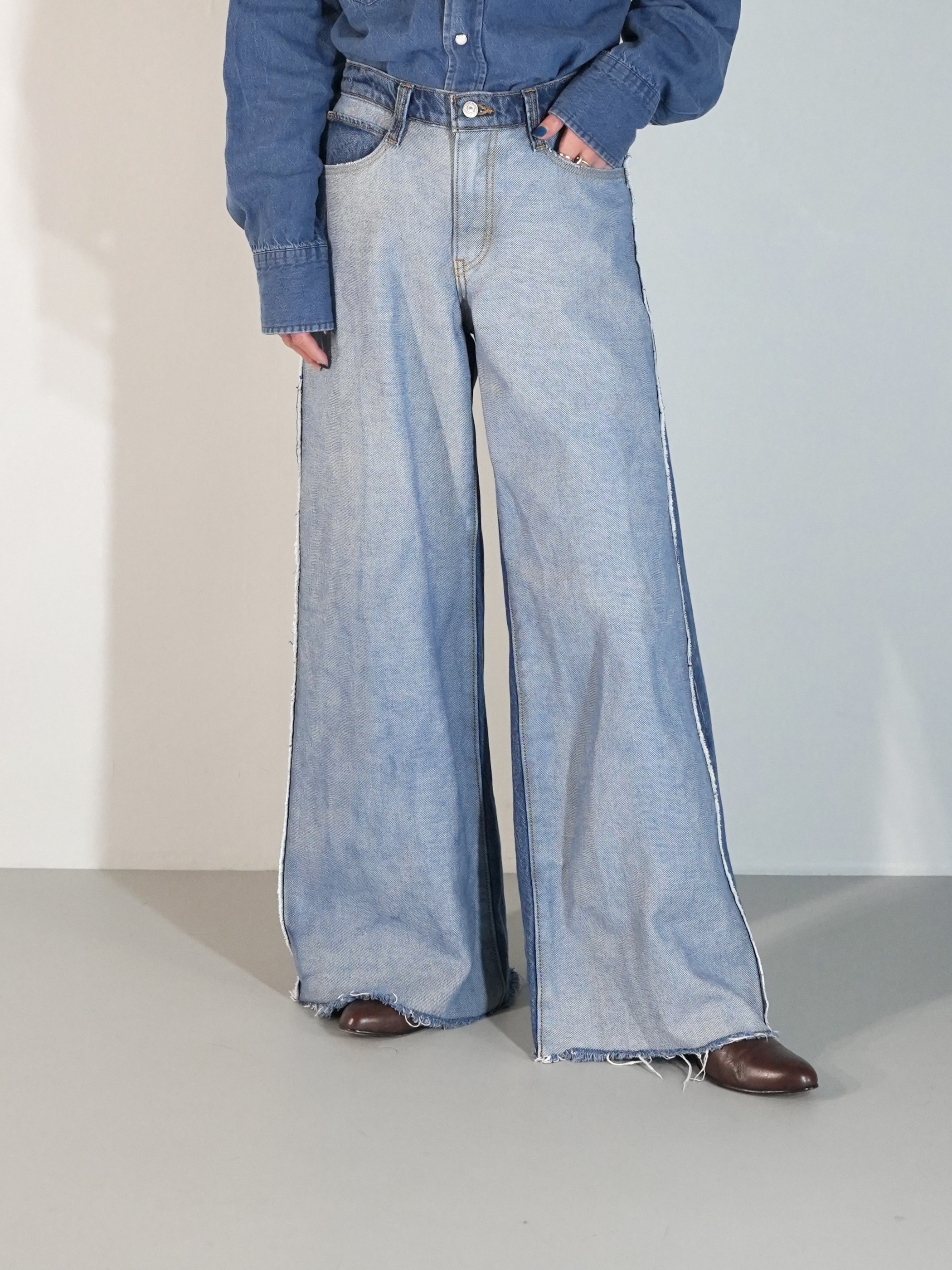 前見頃と後見頃で裏地と表地が切り替えられたワイドバギーデニム。