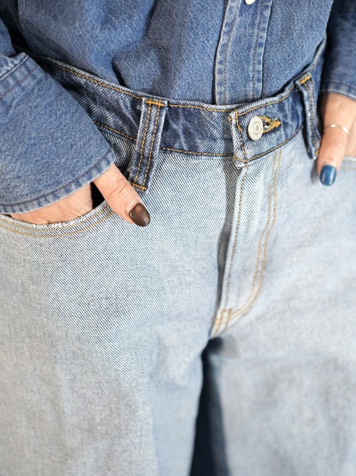 凝ったデザインなのでシンプルにシャツやスウェットを合わせたスタイリングでも、モデルの様にデニムonデニムを楽しむのもおすすめです。