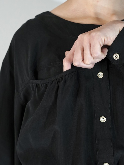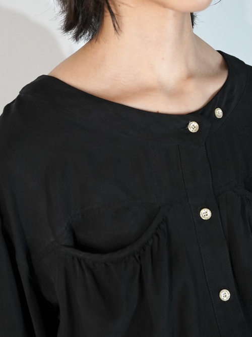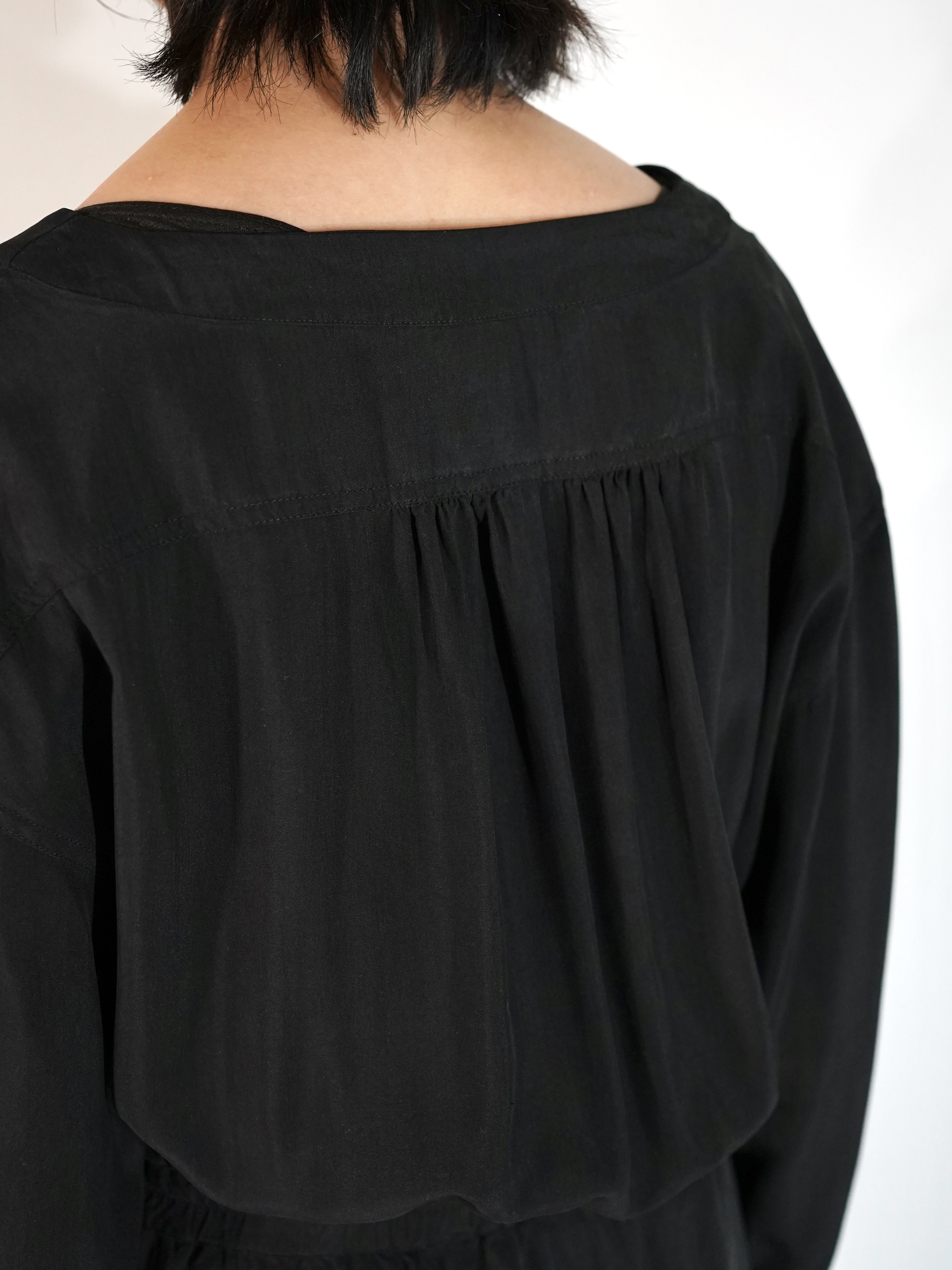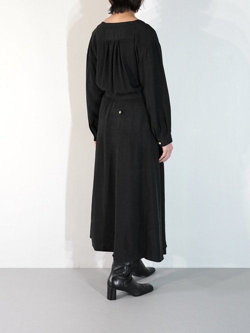 背面やウエストに無数のギャザーが入り、それによって生まれるドレープが美しい1着。