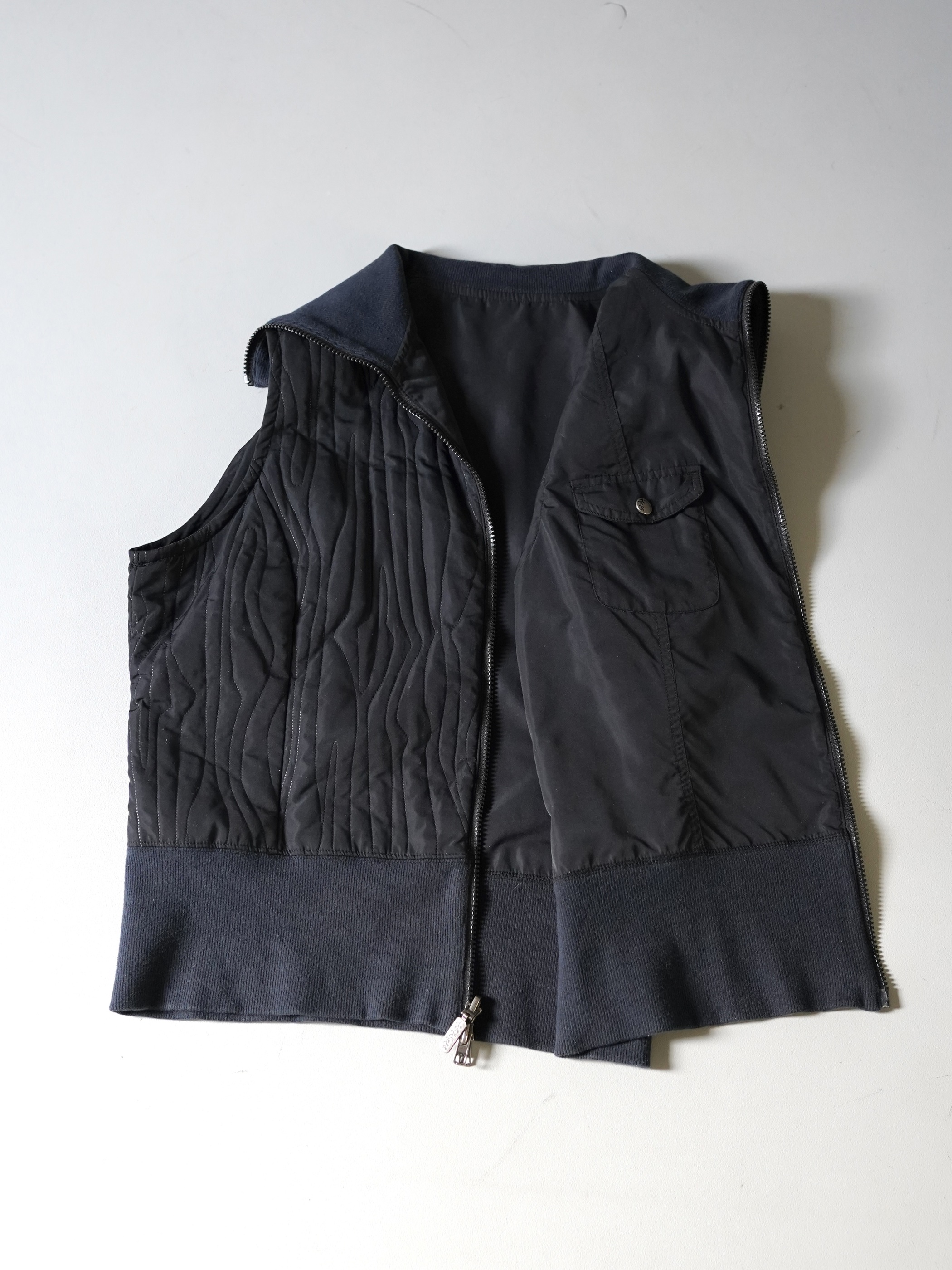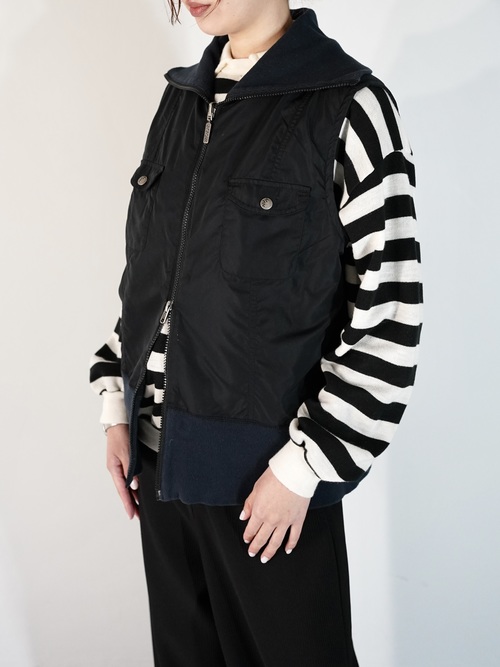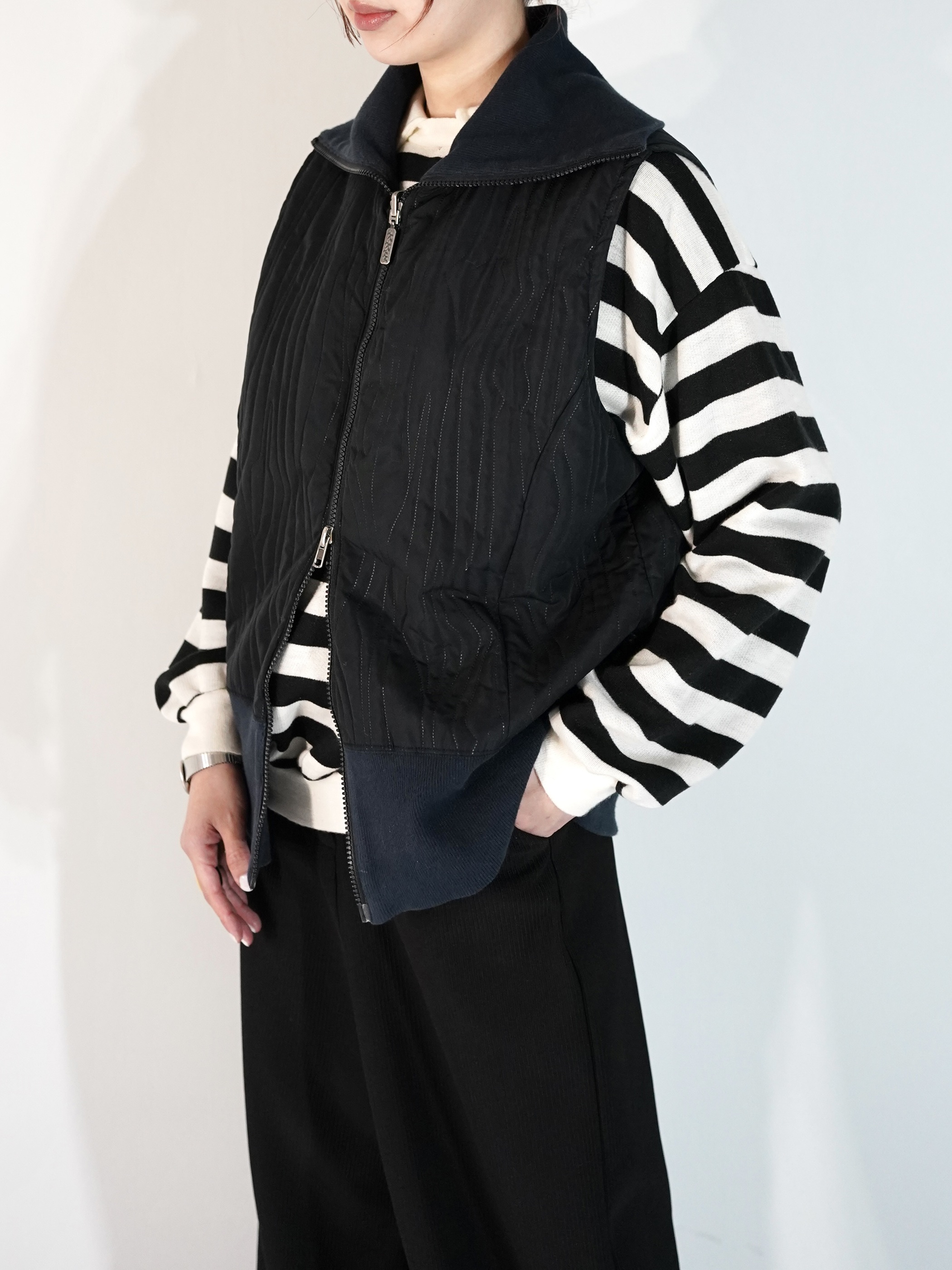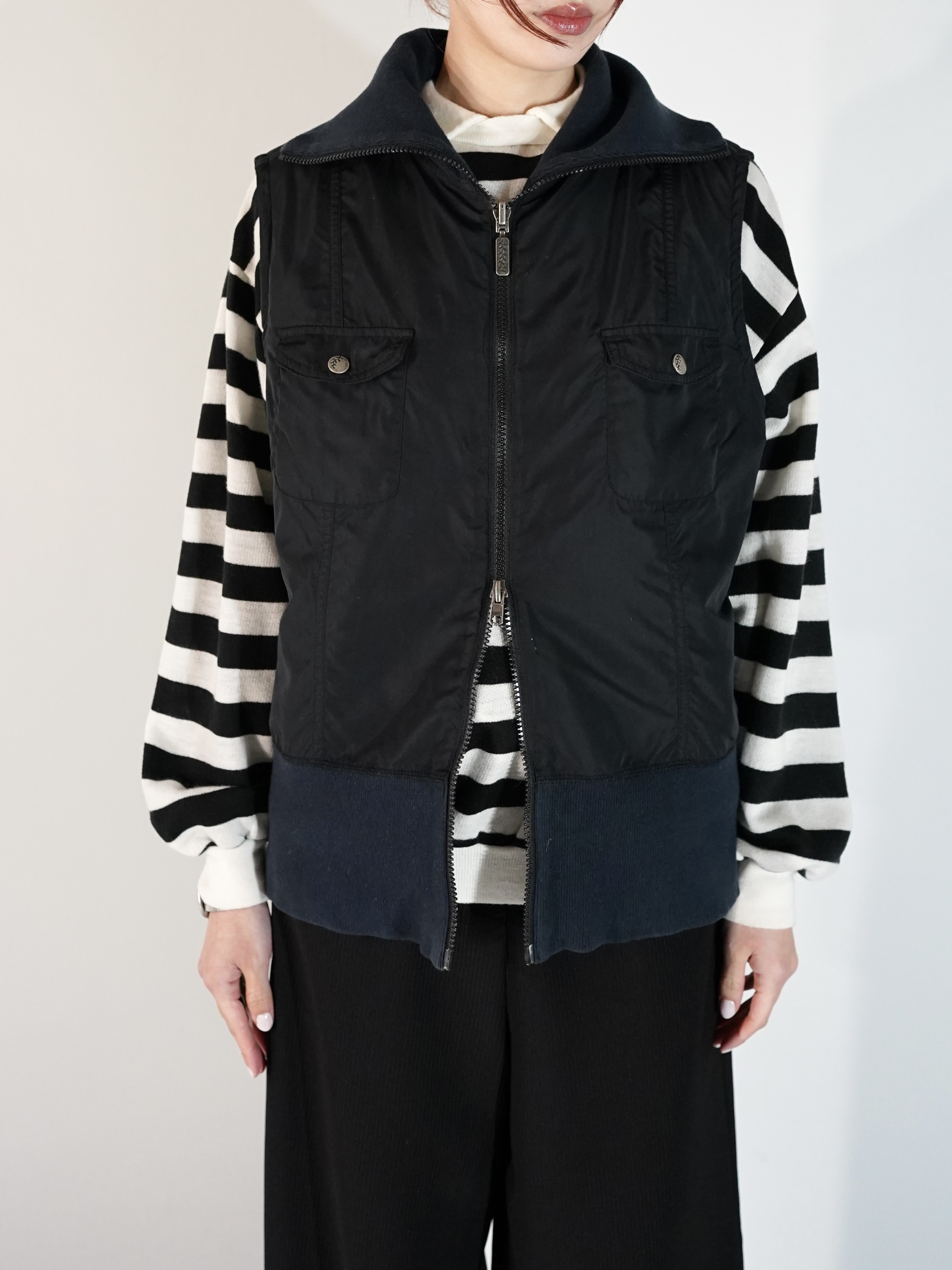 ランダムにステッチが入った面と胸ポケがある面の2フェイスベスト