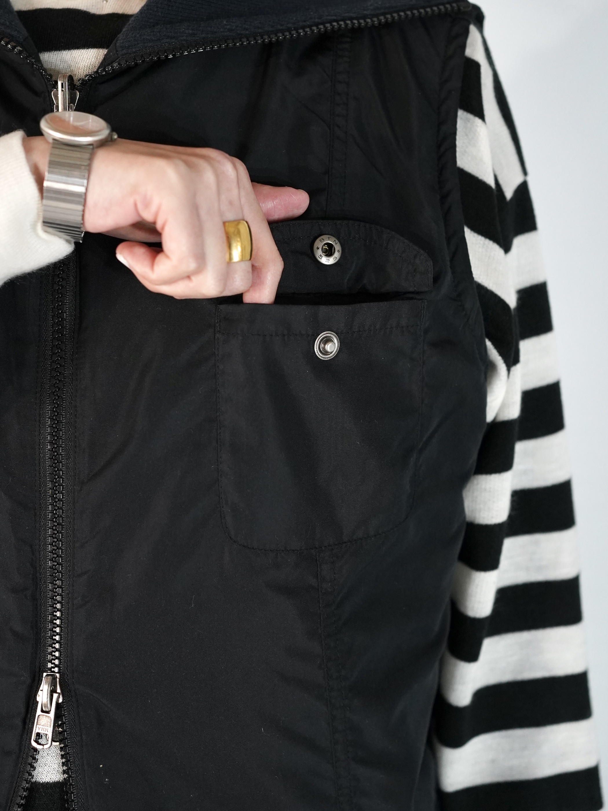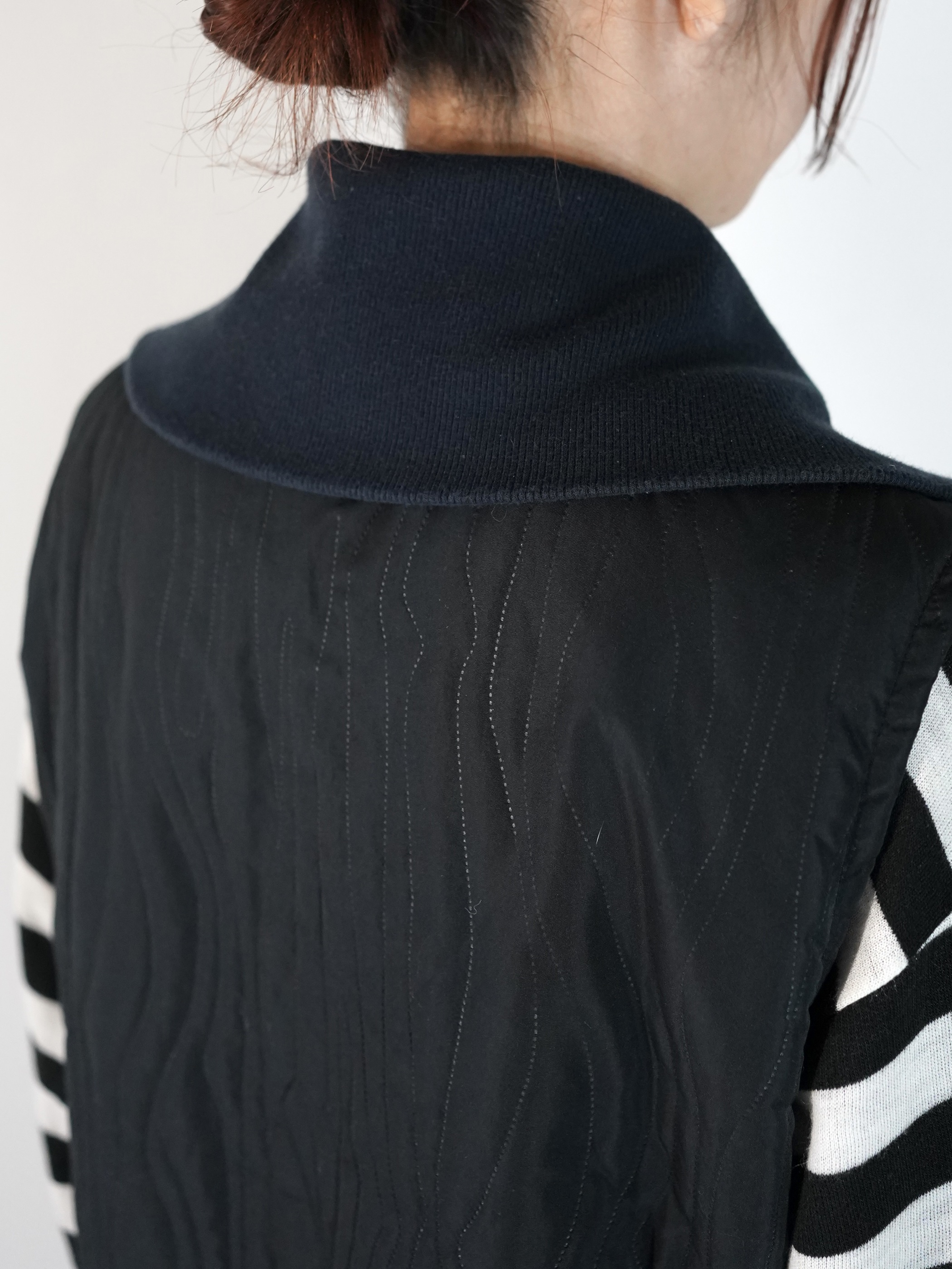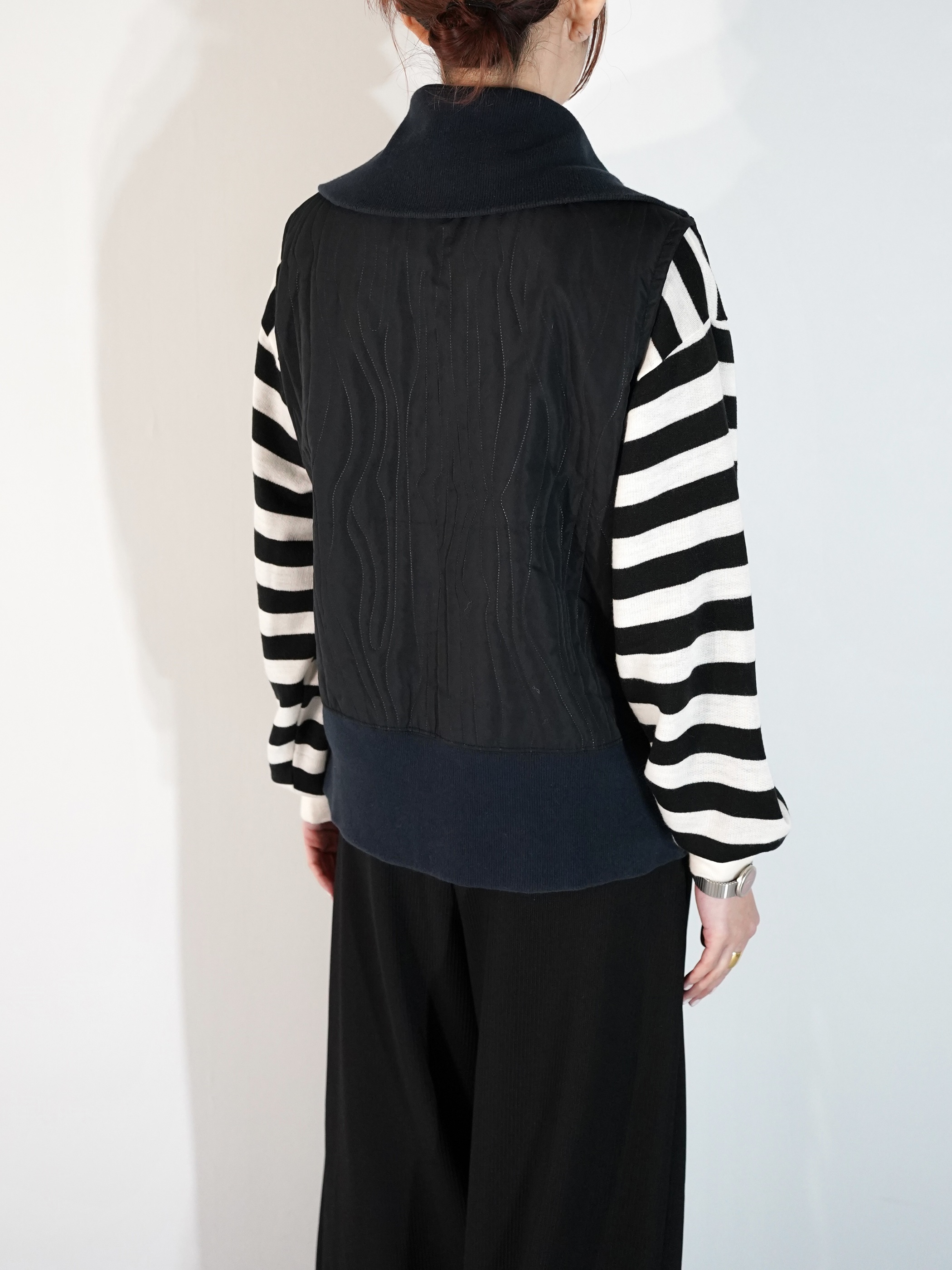 ランダムにステッチが入った面と胸ポケがある面の2フェイスベスト