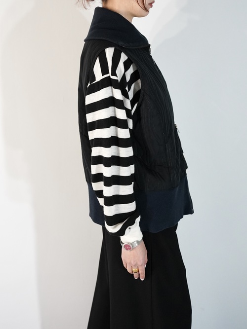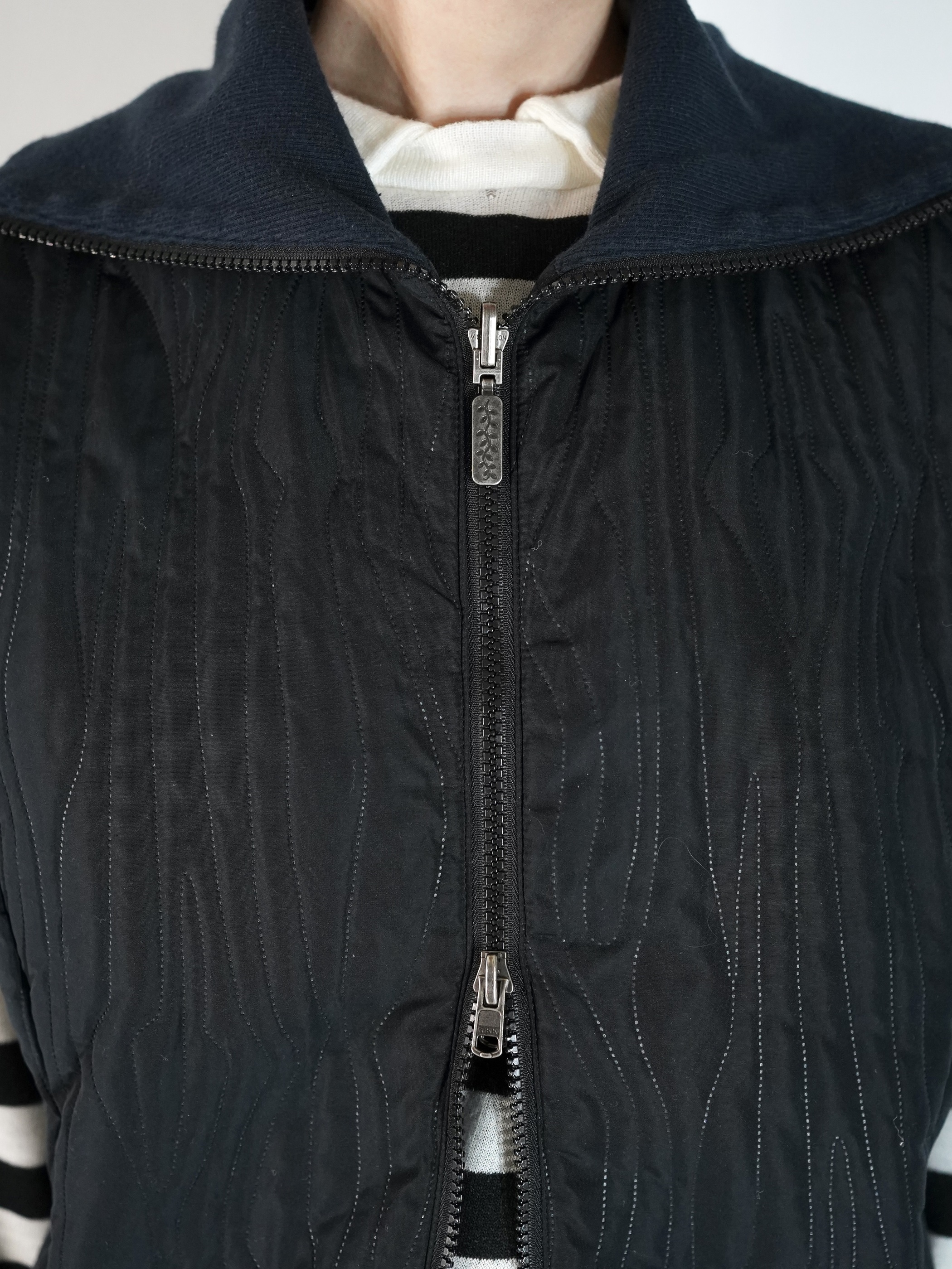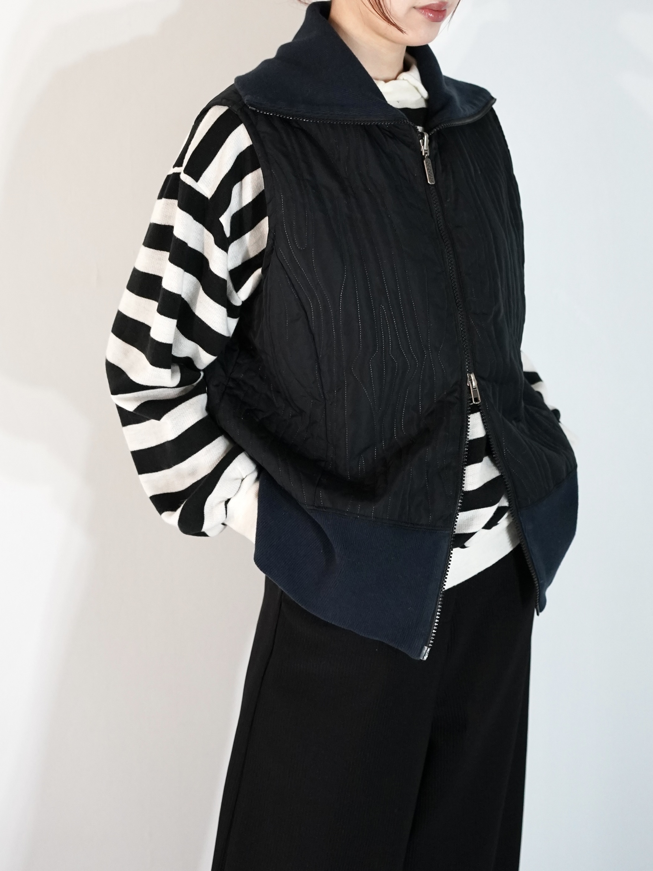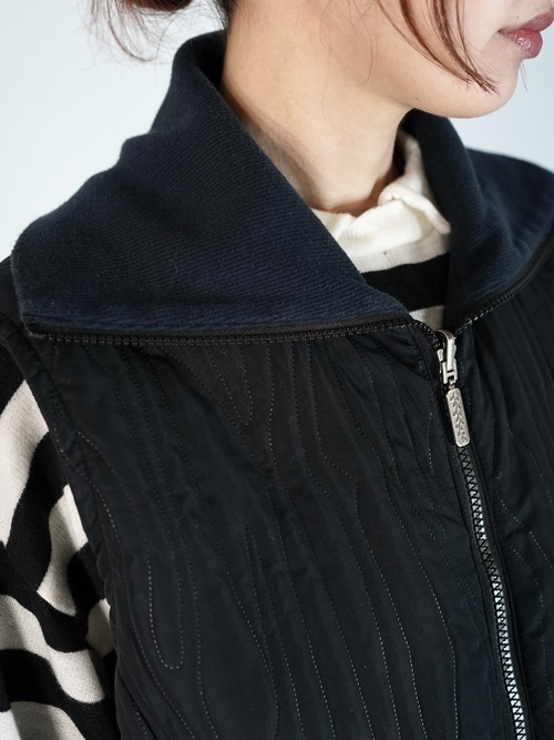 薄い中綿入り仕様、今時期トップスやシャツ等の上に重ね易い生地感です