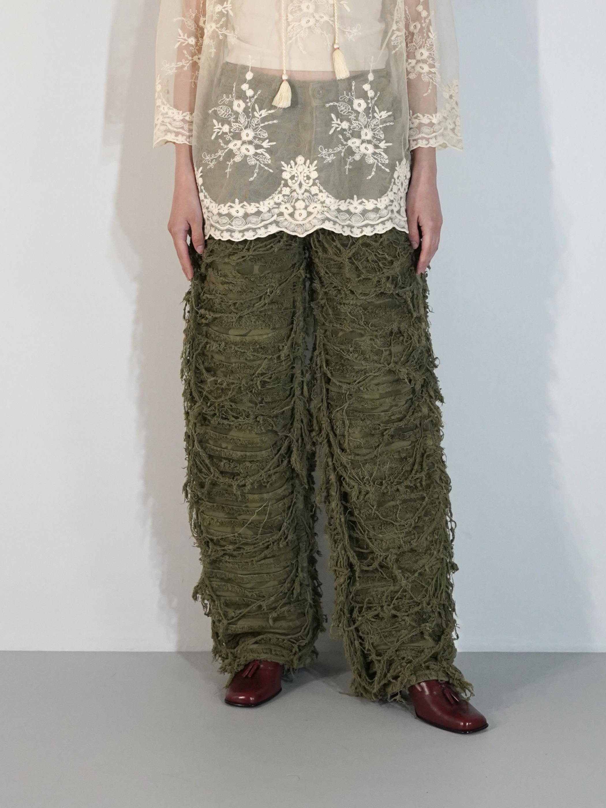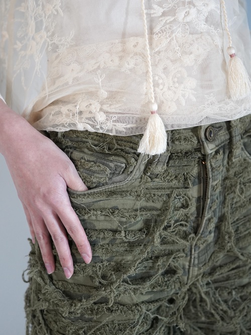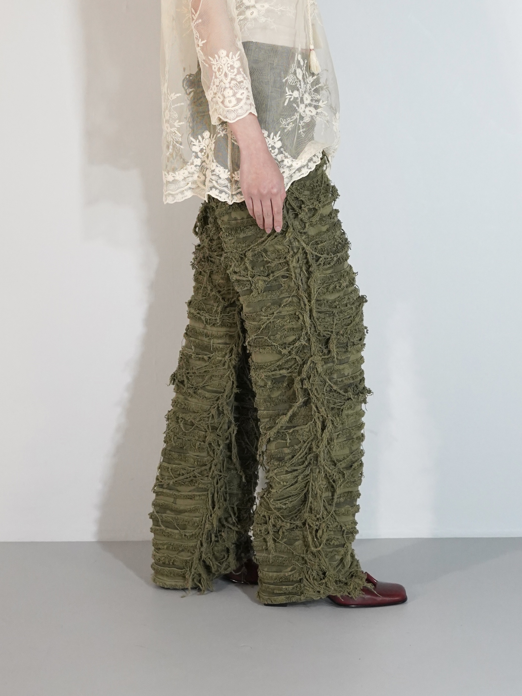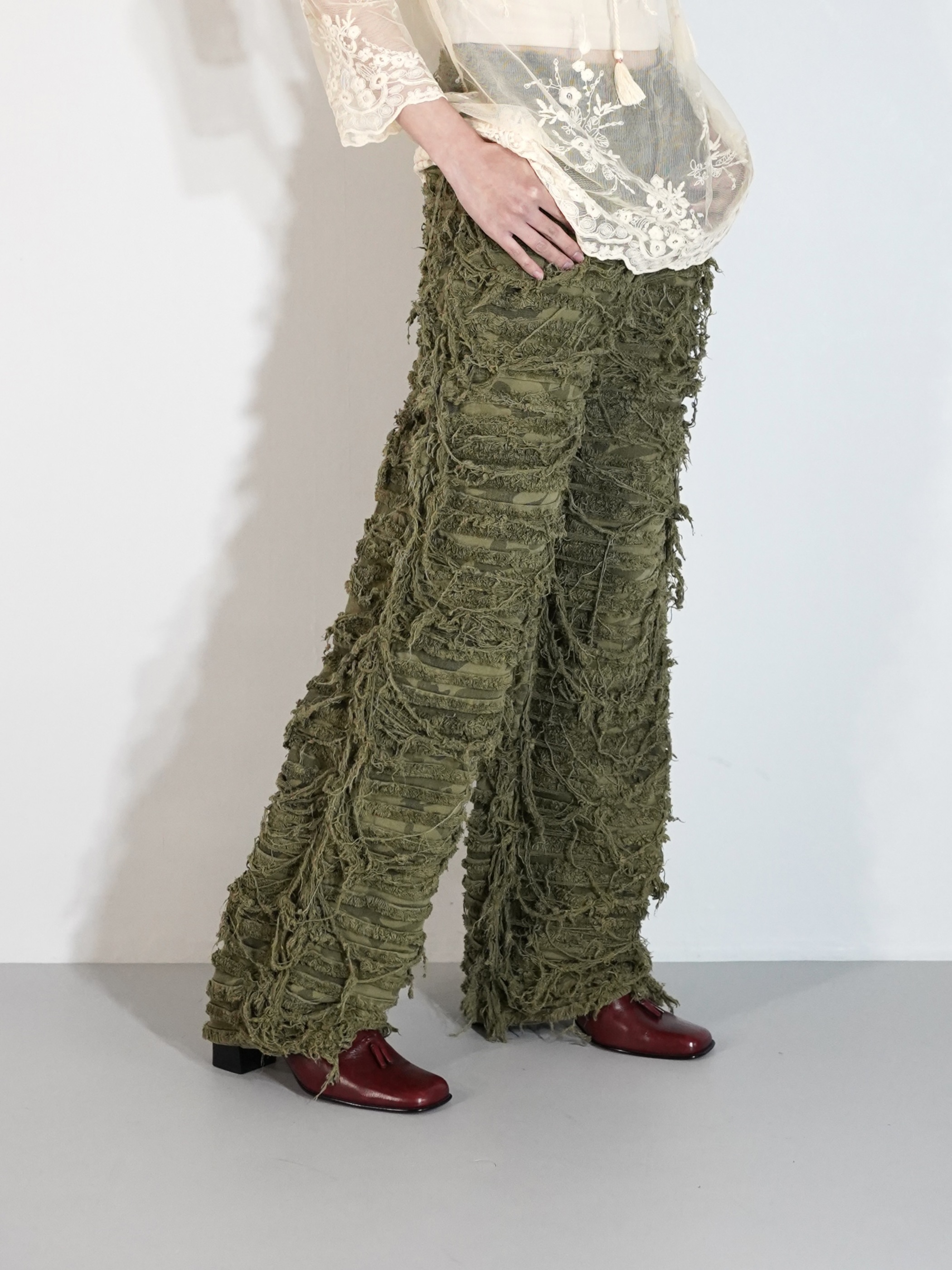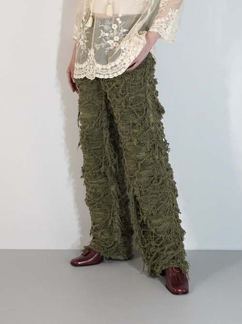 スラッシュ状にカットを入れ、全体を横上にフリンジ化、退廃的な表情のデストロイトパンツ
