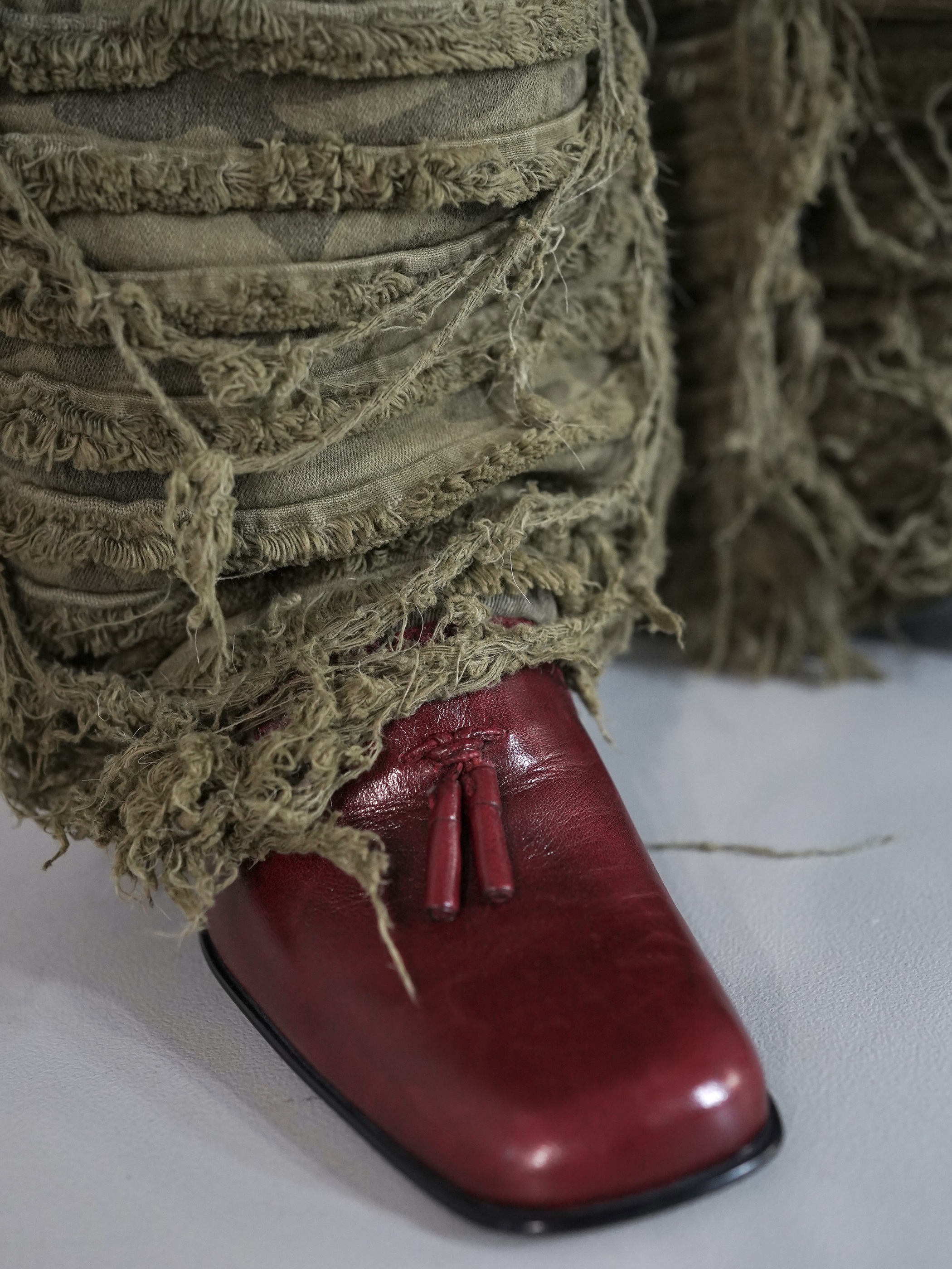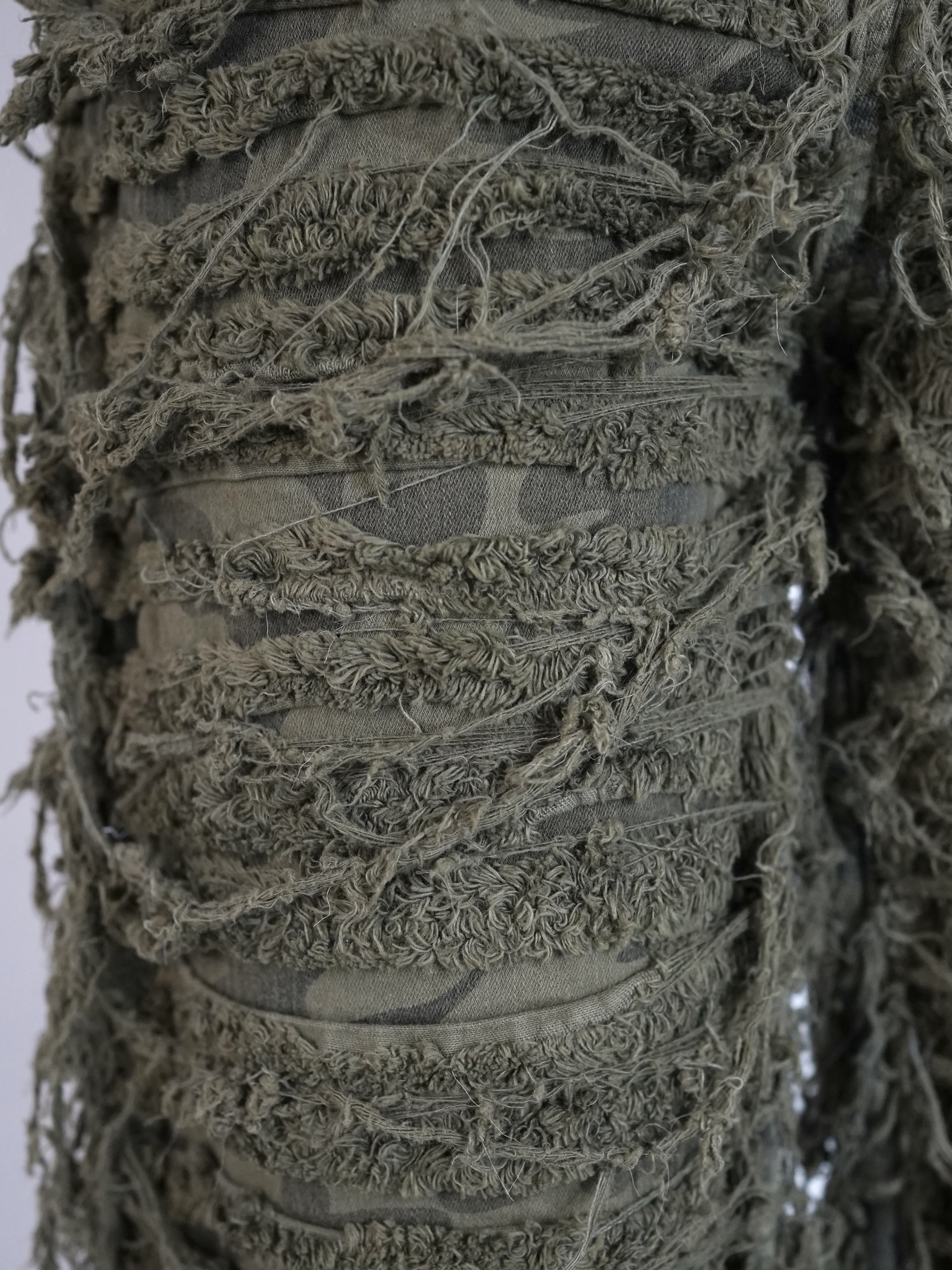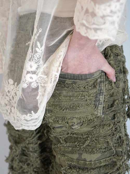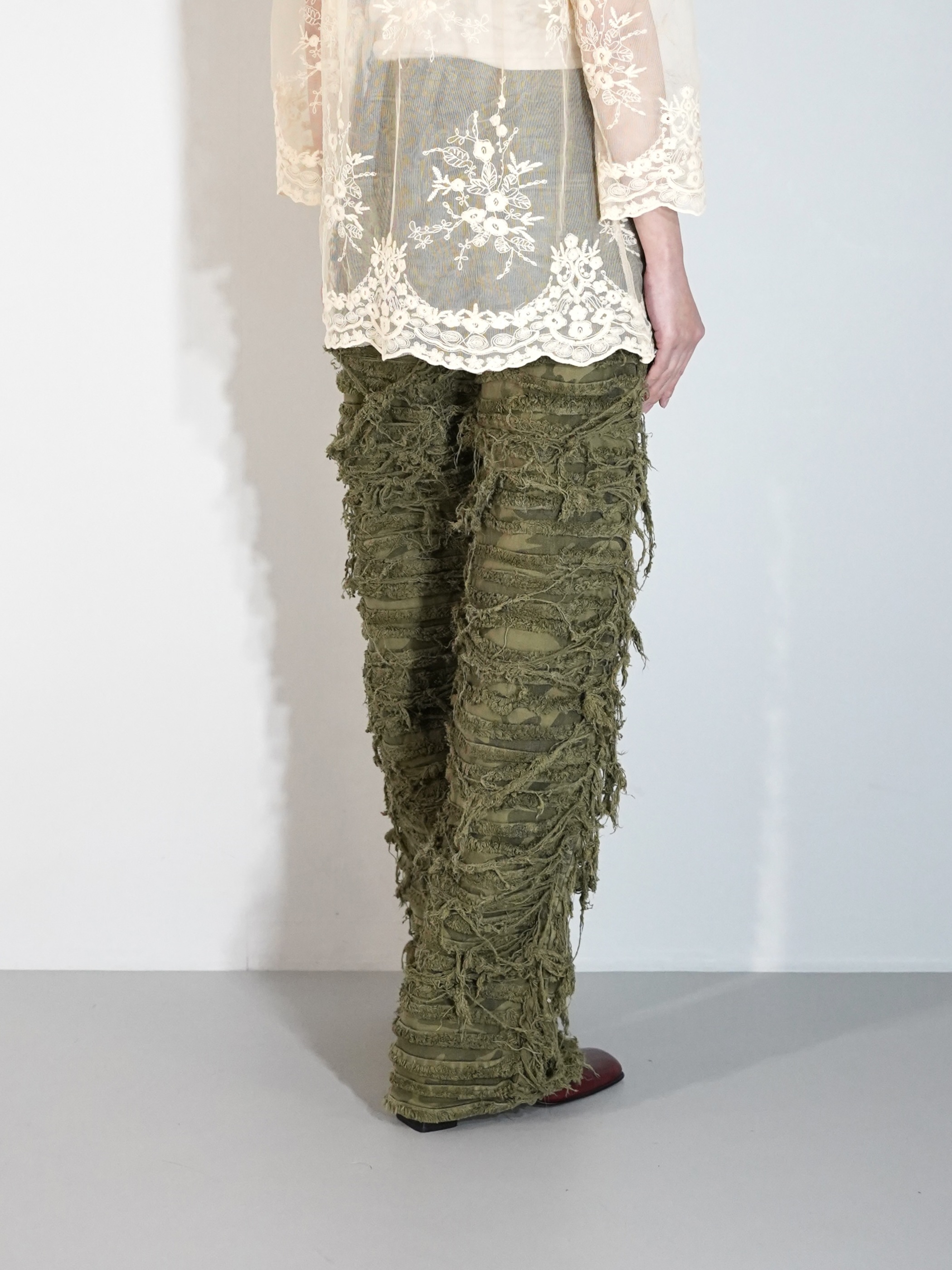 スラッシュ状にカットを入れ、全体を横上にフリンジ化、退廃的な表情のデストロイトパンツ