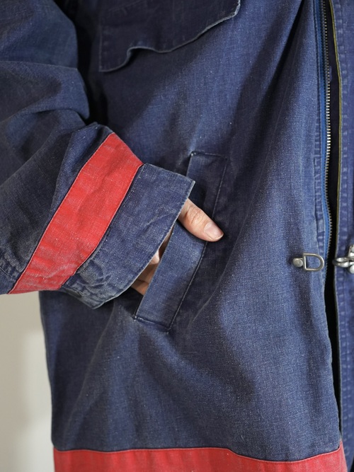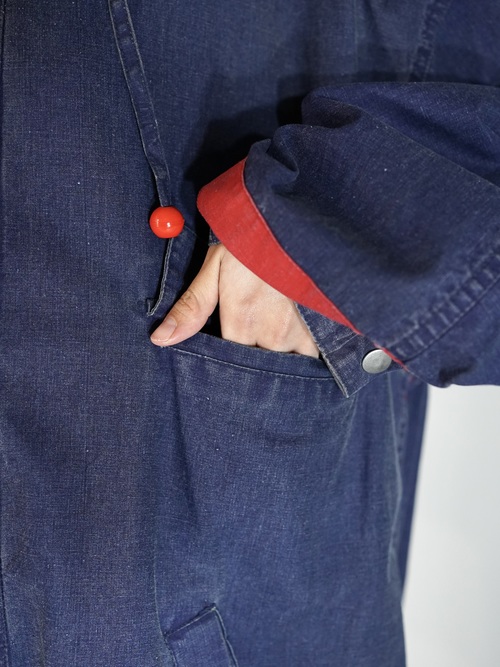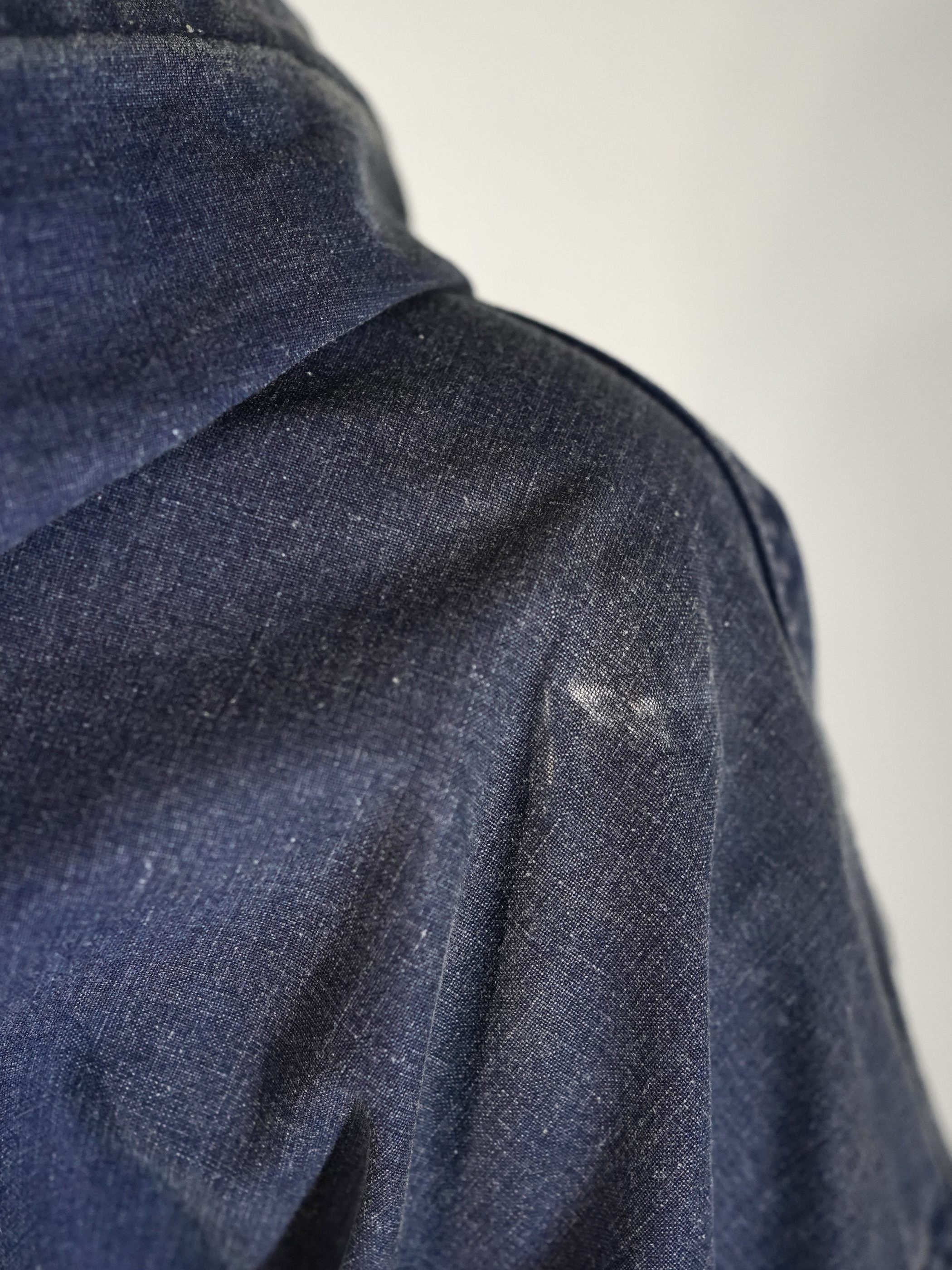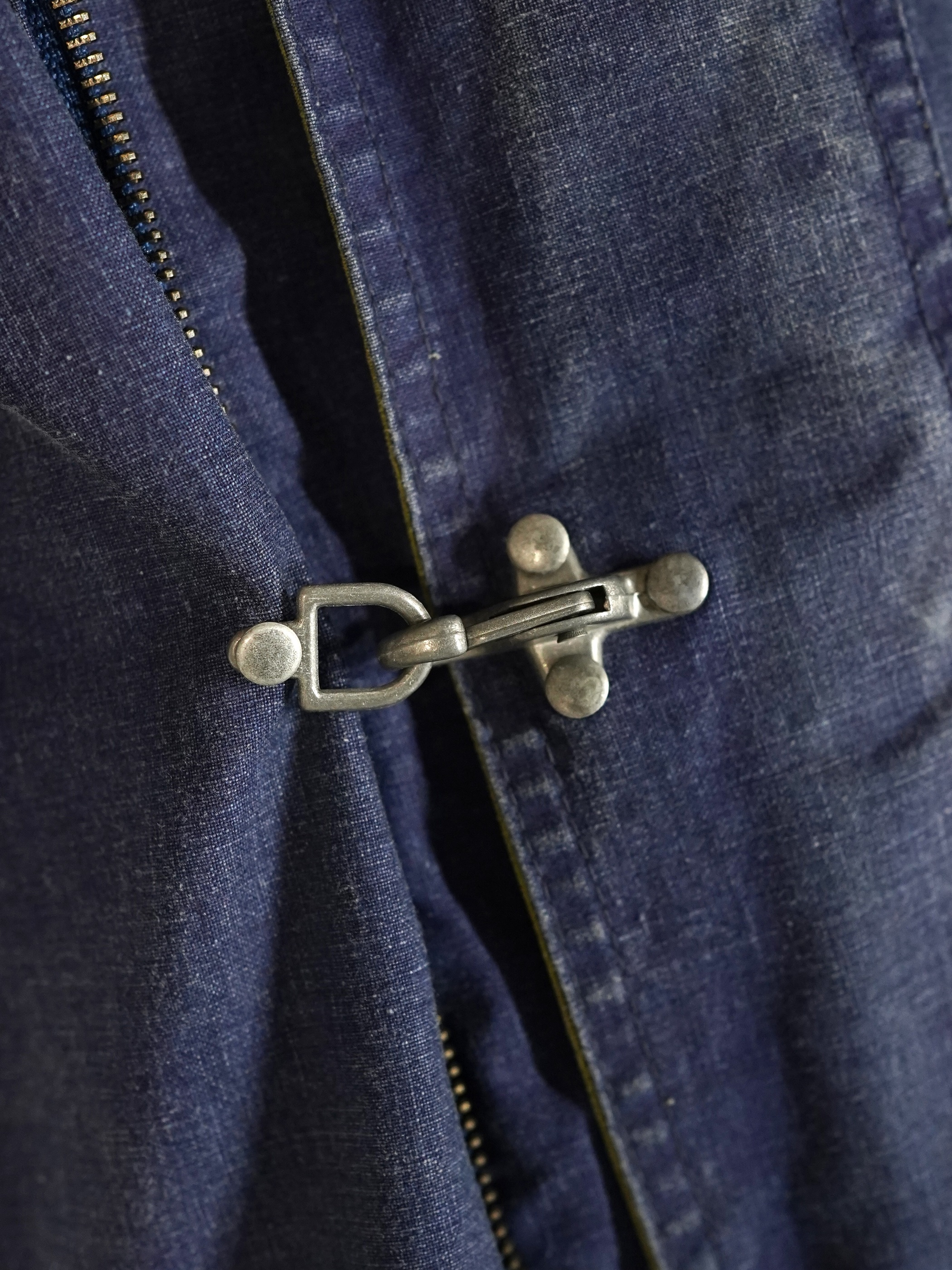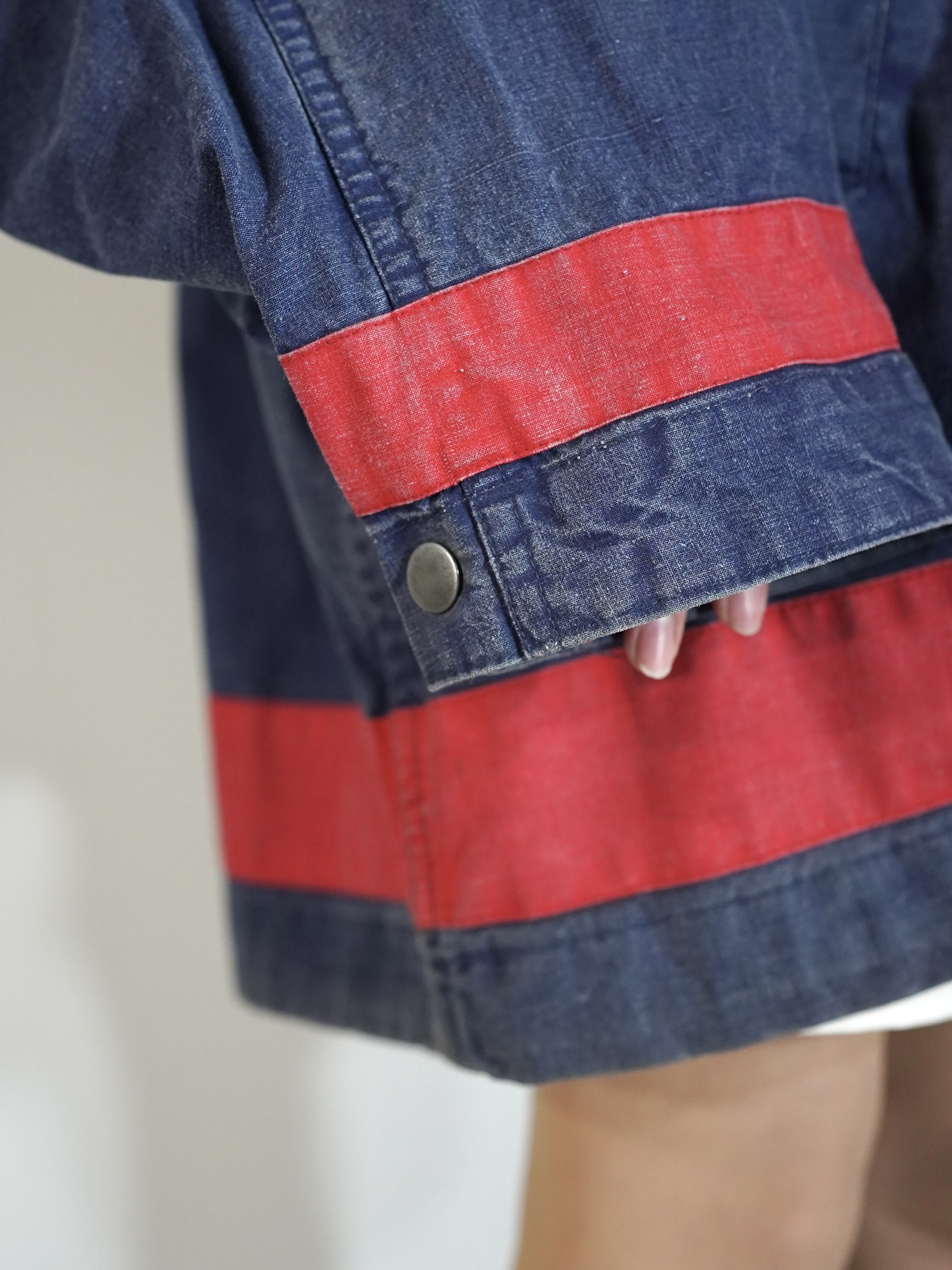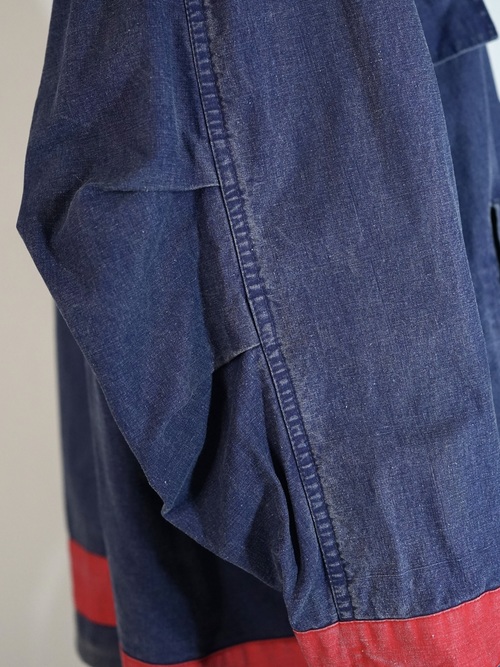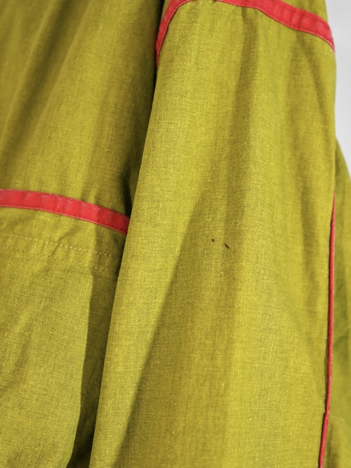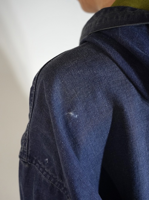 張りのあるコットン地で経年により色落ち、パッカリング等出て雰囲気がある個体