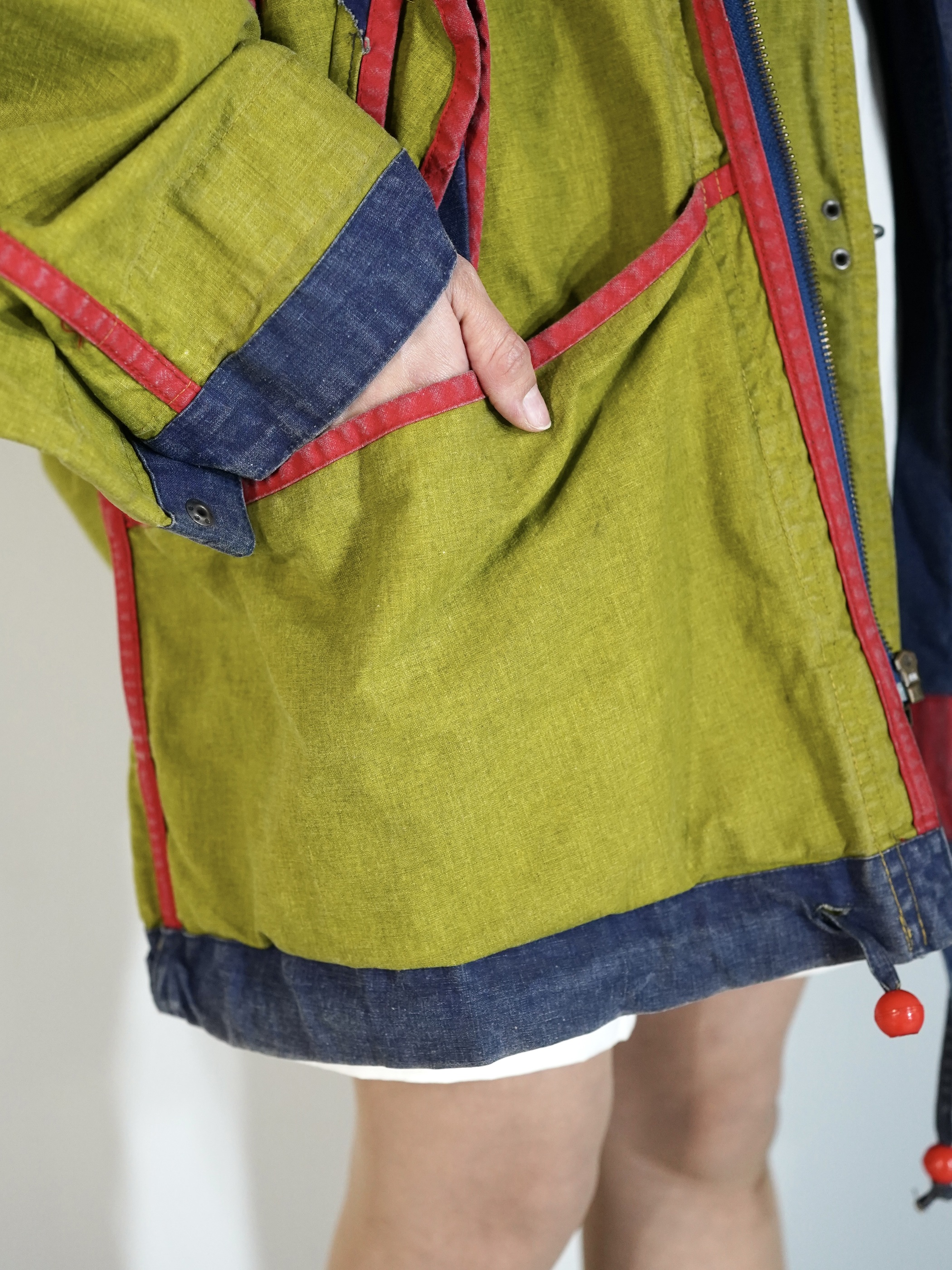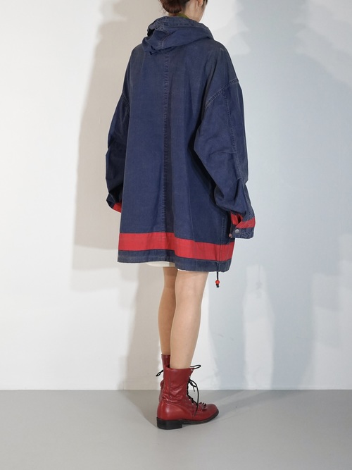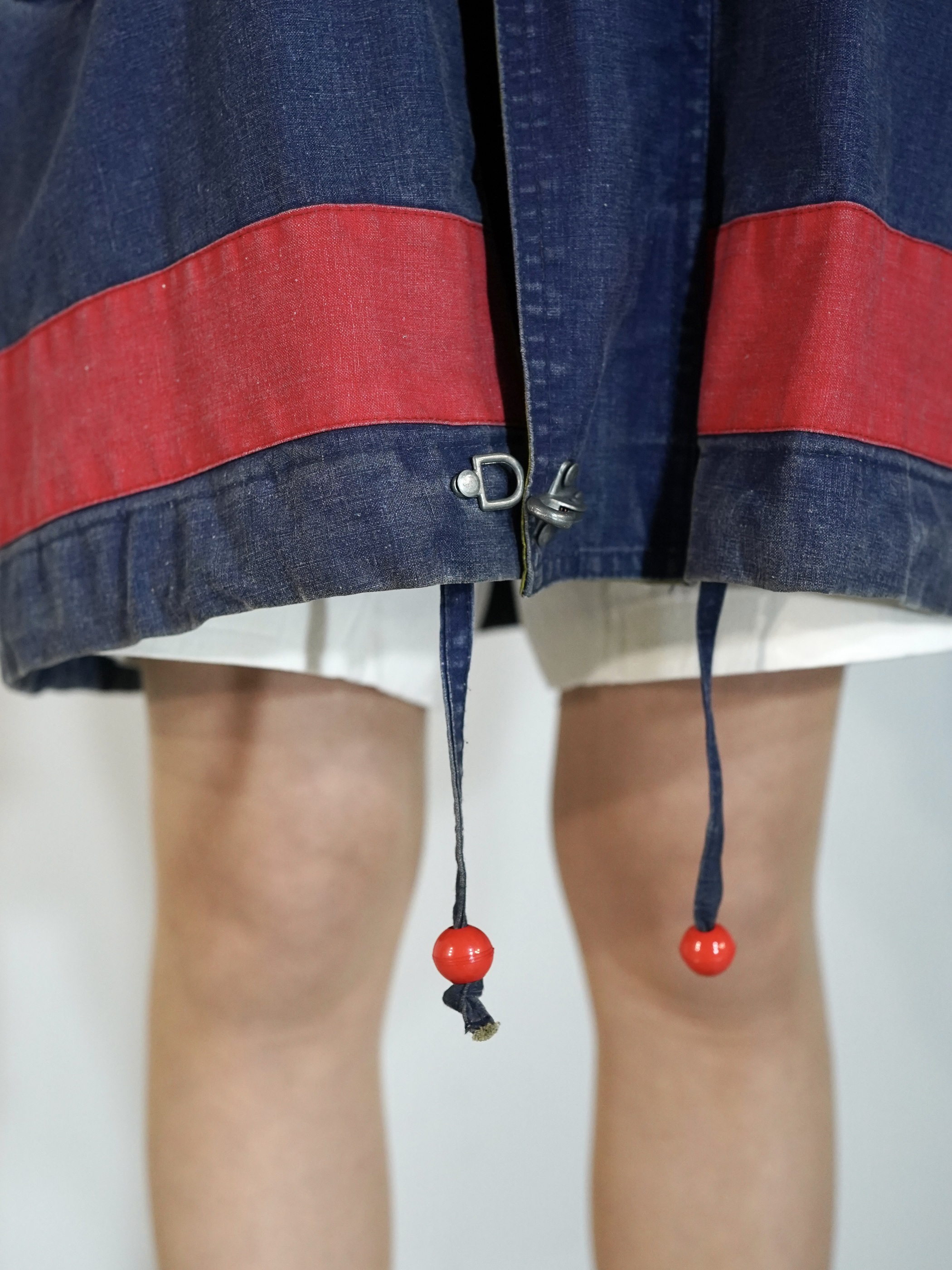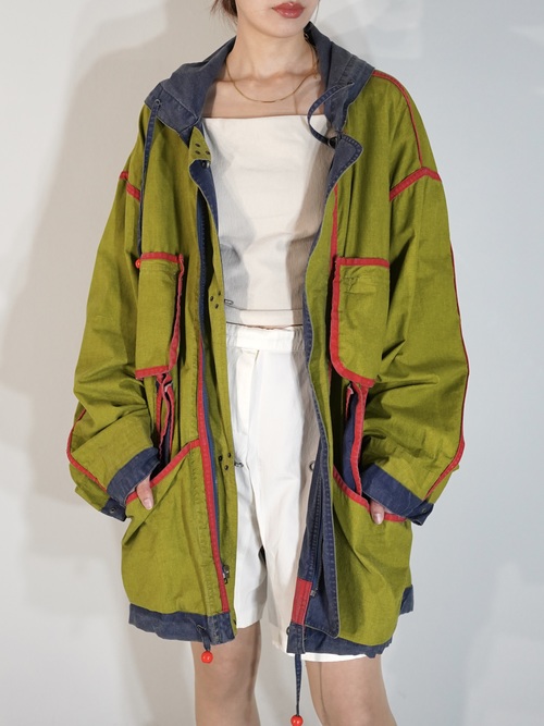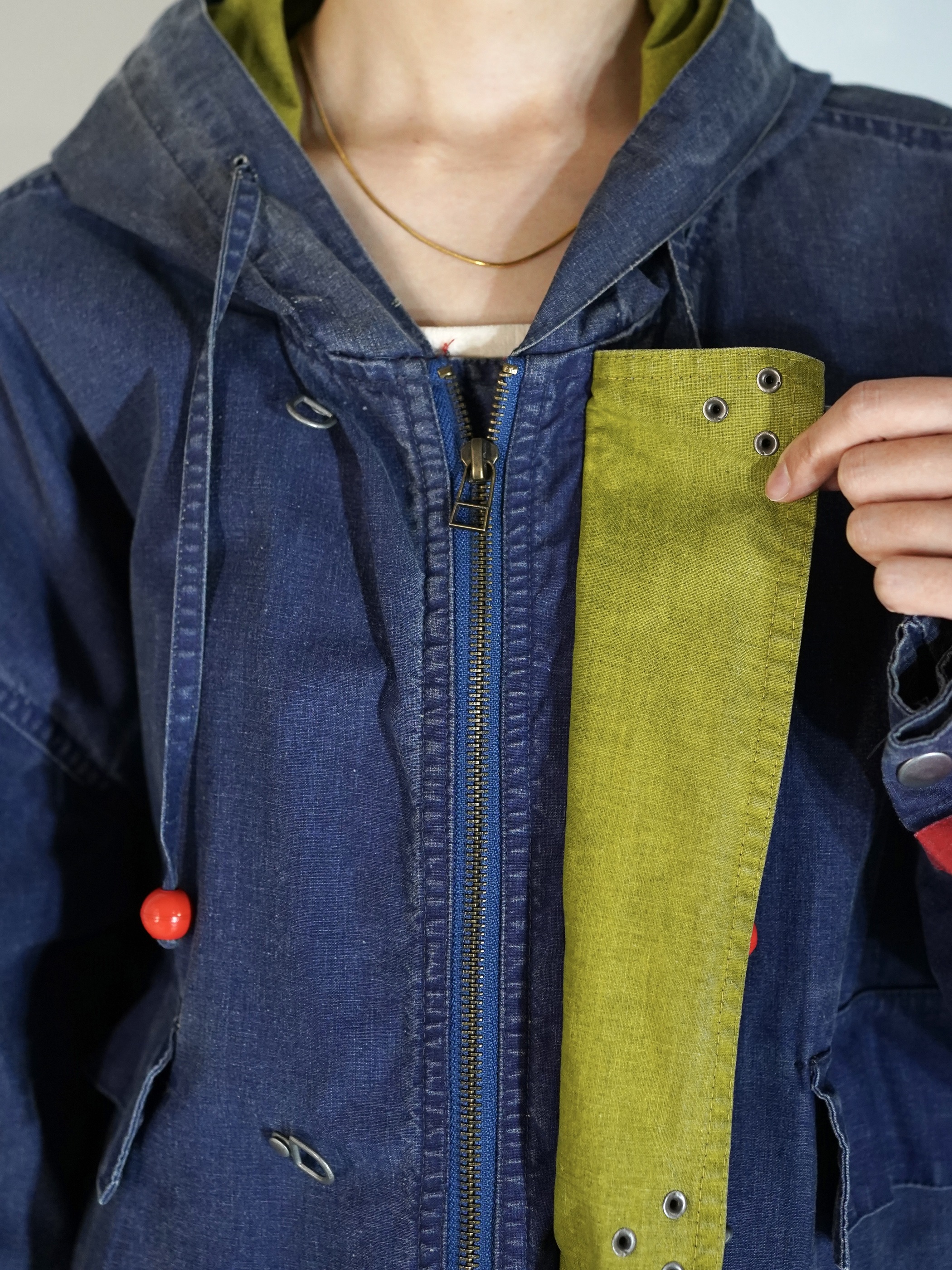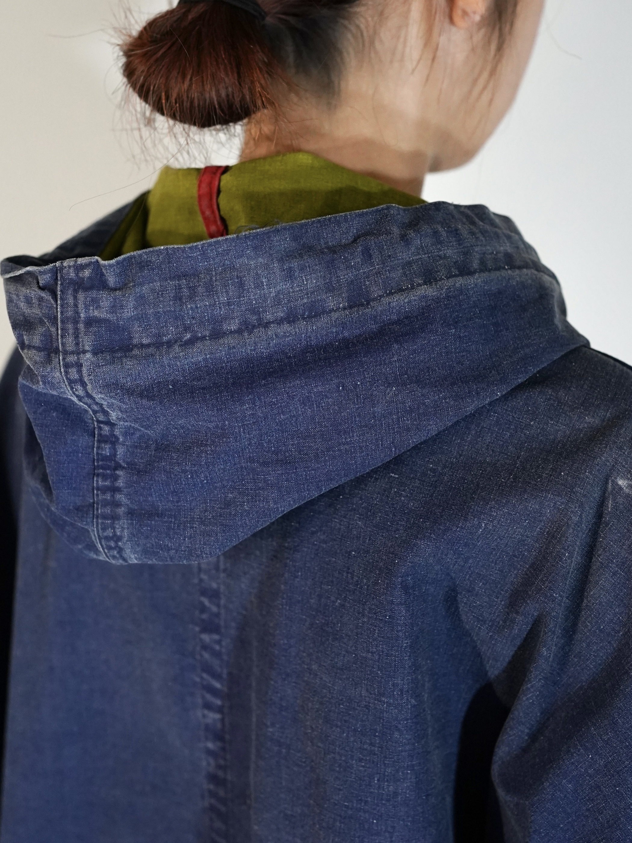 張りのあるコットン地で経年により色落ち、パッカリング等出て雰囲気がある個体