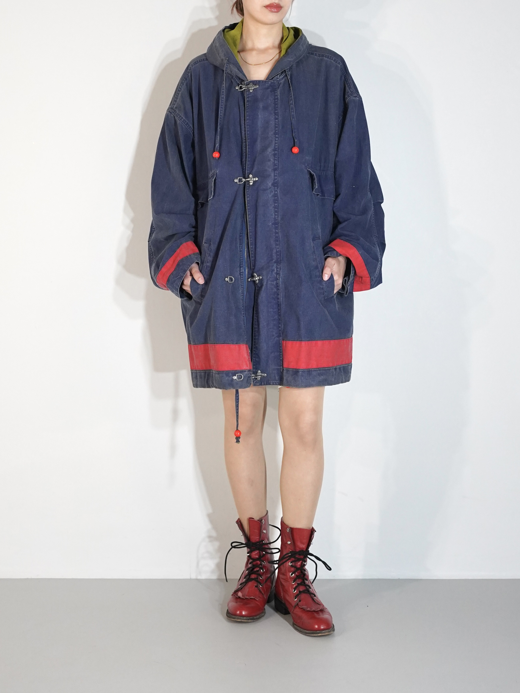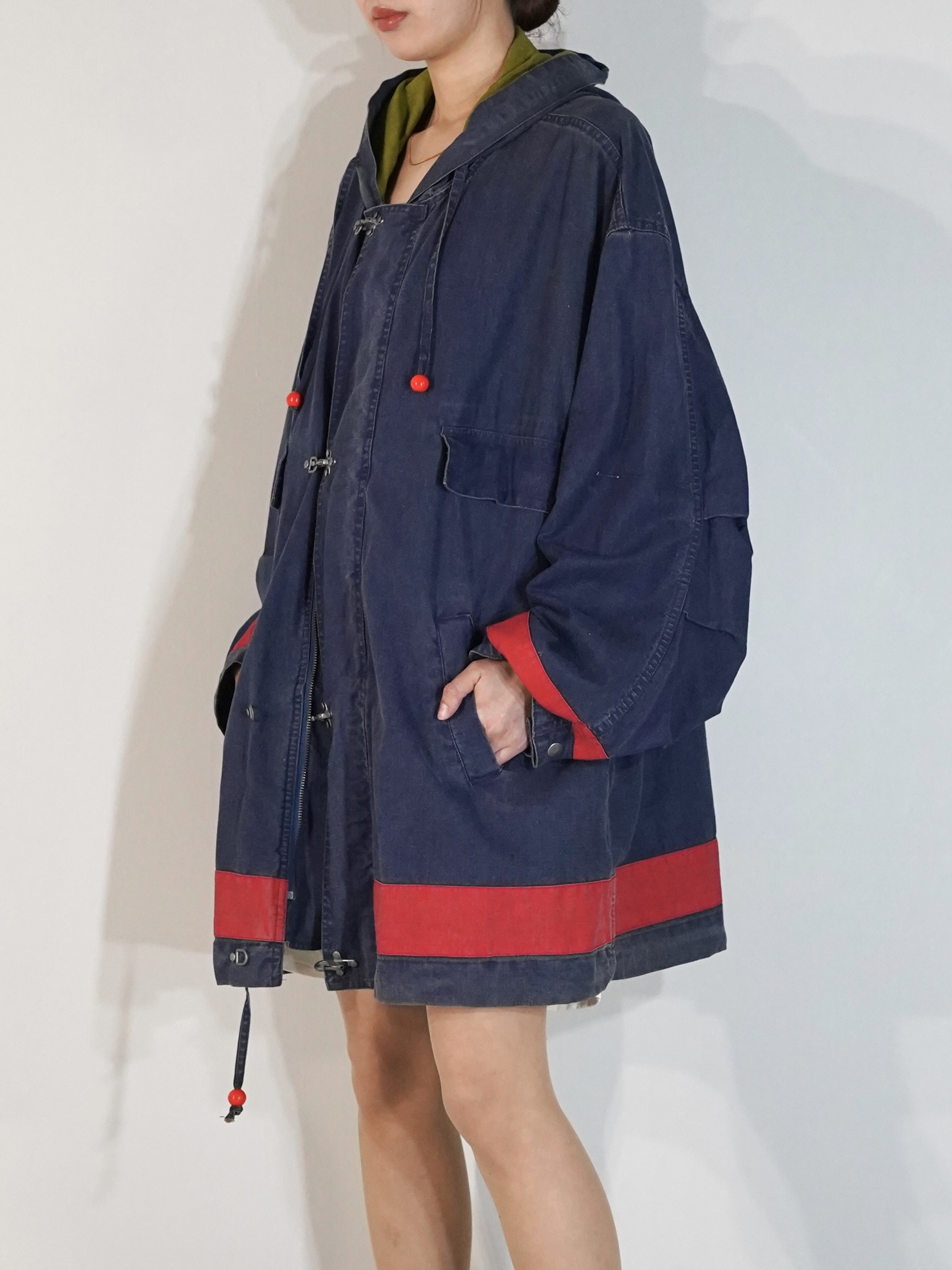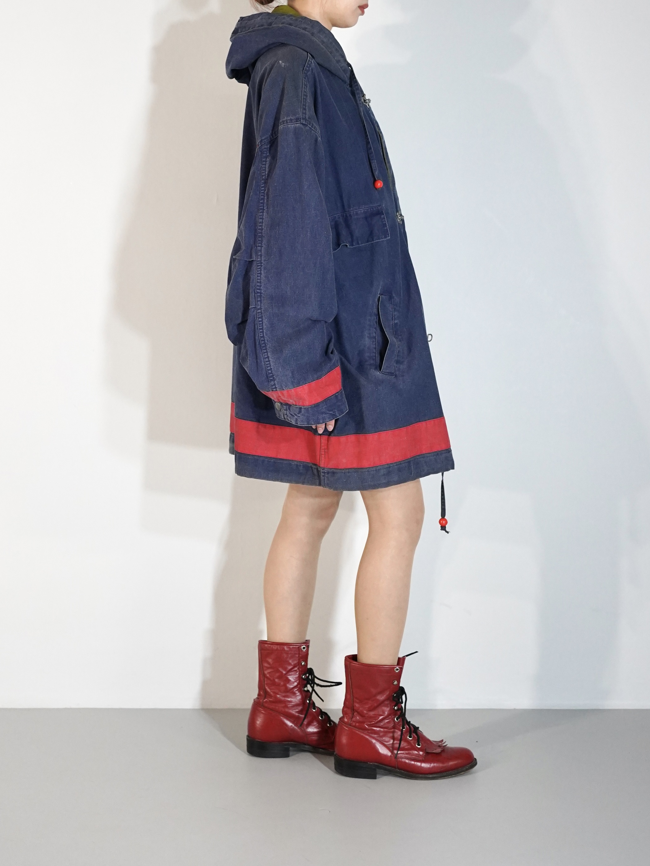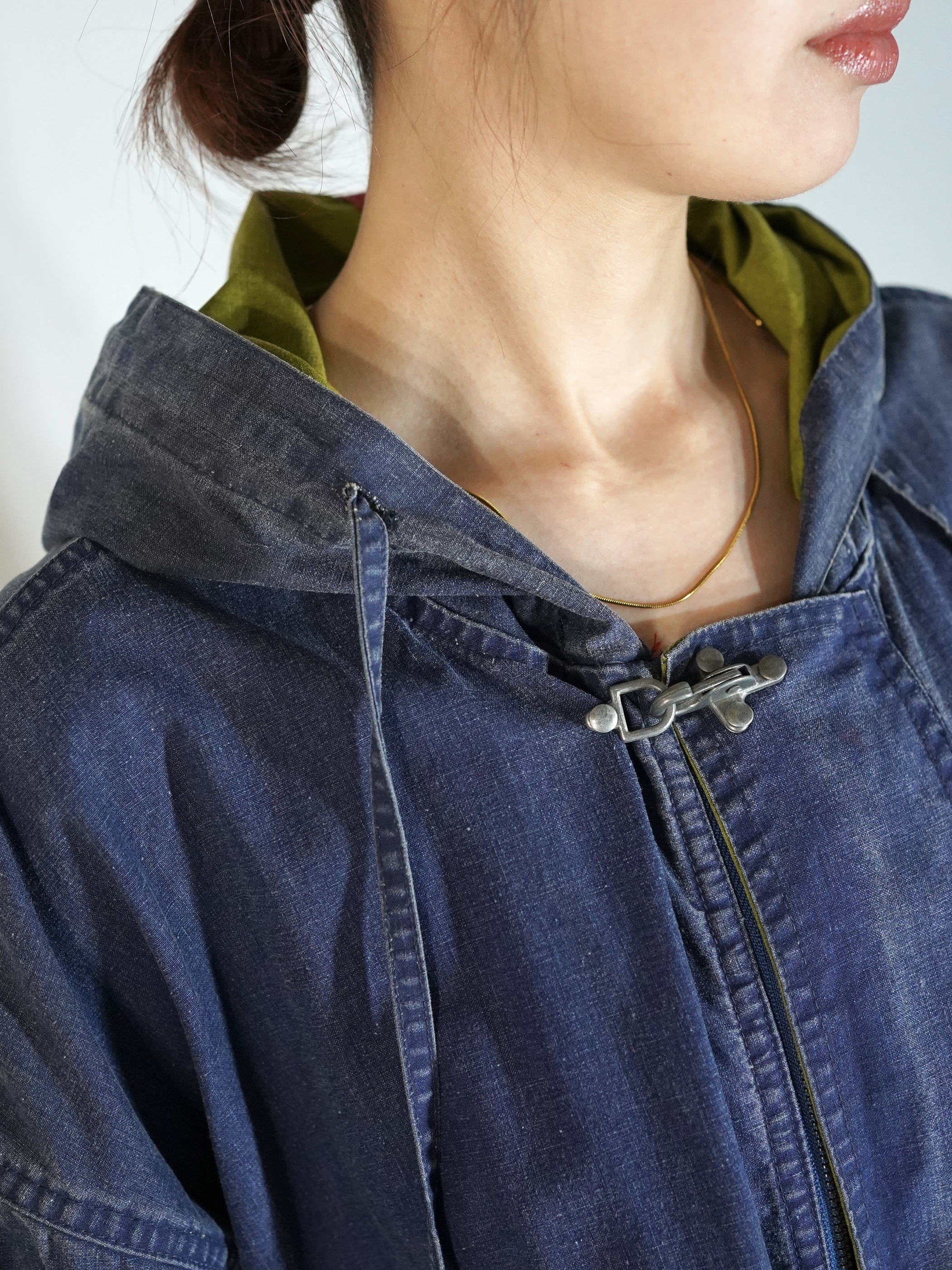 張りのあるコットン地で経年により色落ち、パッカリング等出て雰囲気がある個体