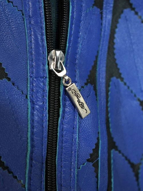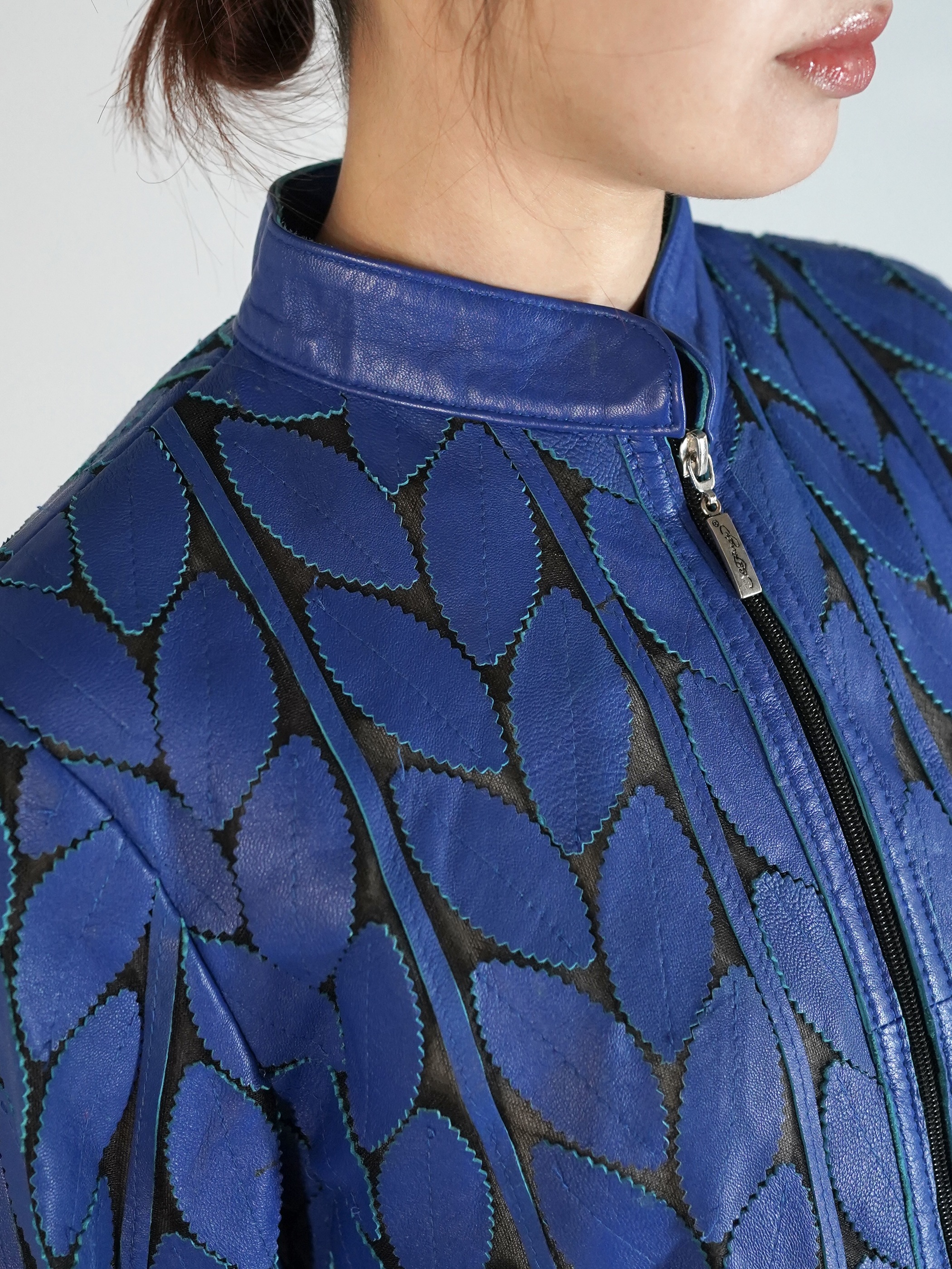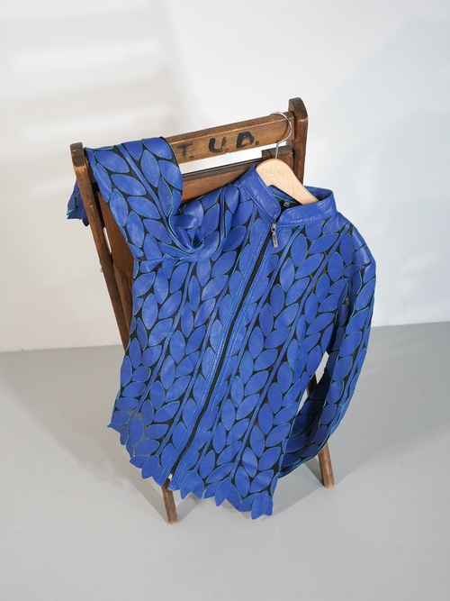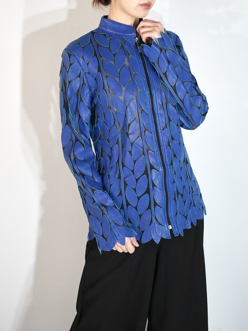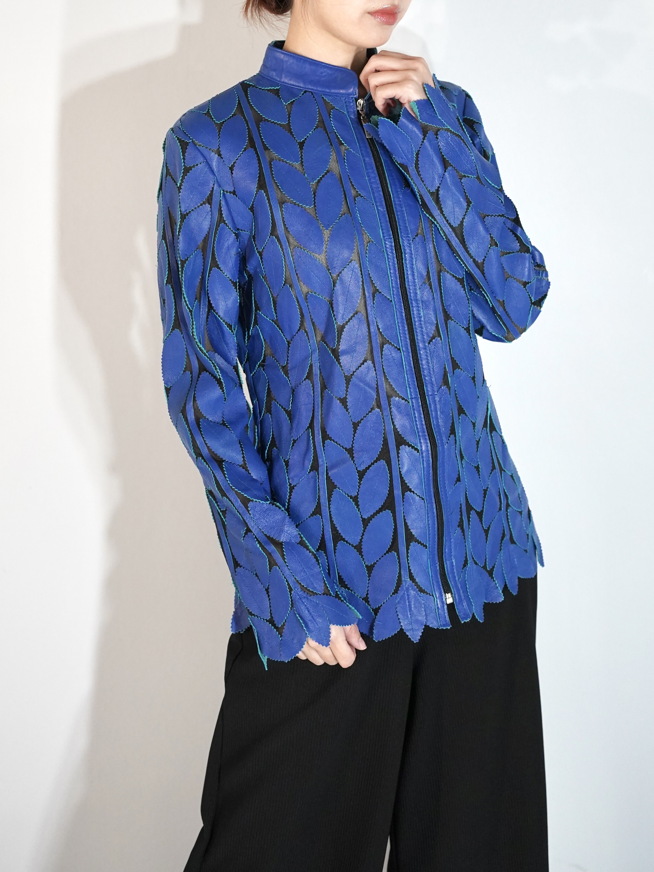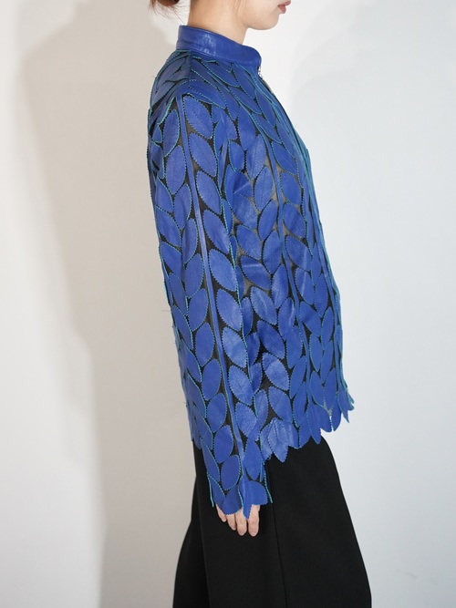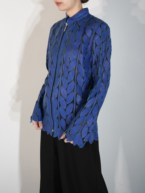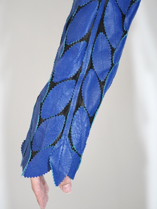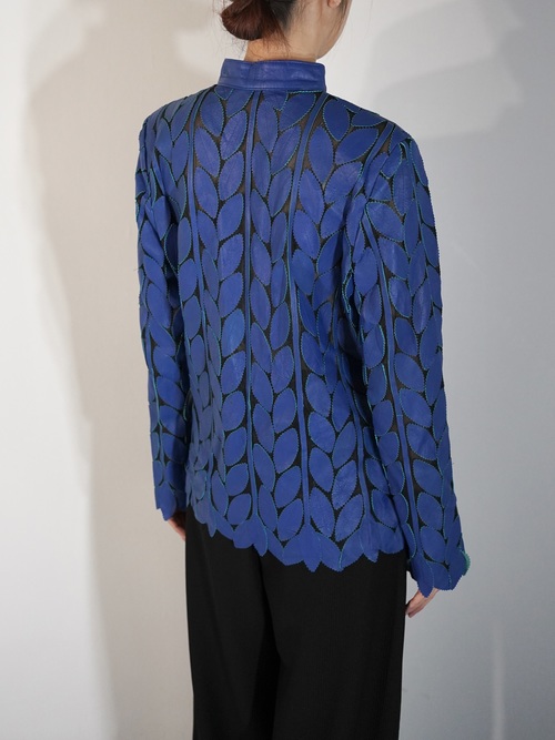 リーフ状の発色の良いカラーレザーをシアー生地に縫い付けた、なんとも洒落たデザイン