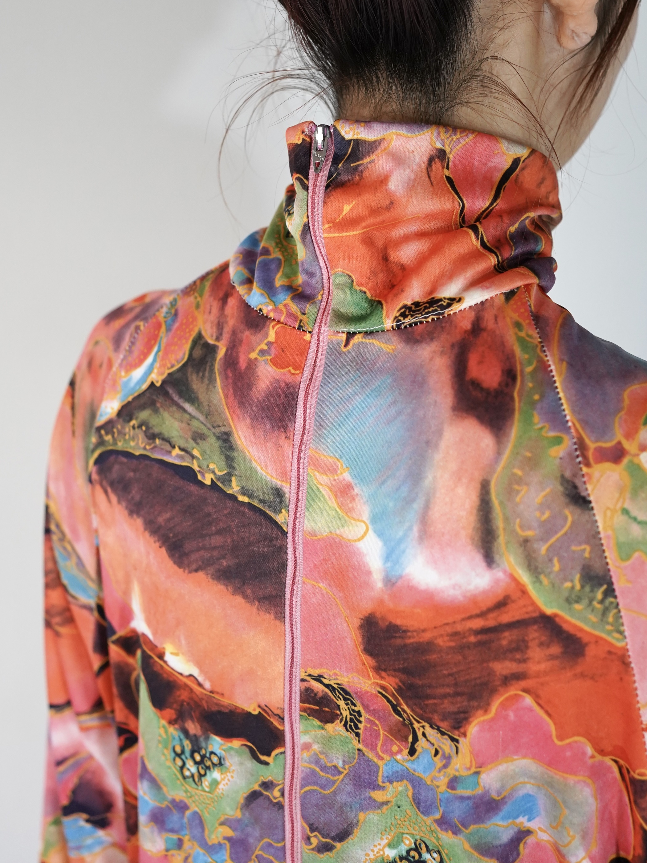 本来ジップが後ろに来る形状になりますが、どちらの面でも着れる仕様となります。