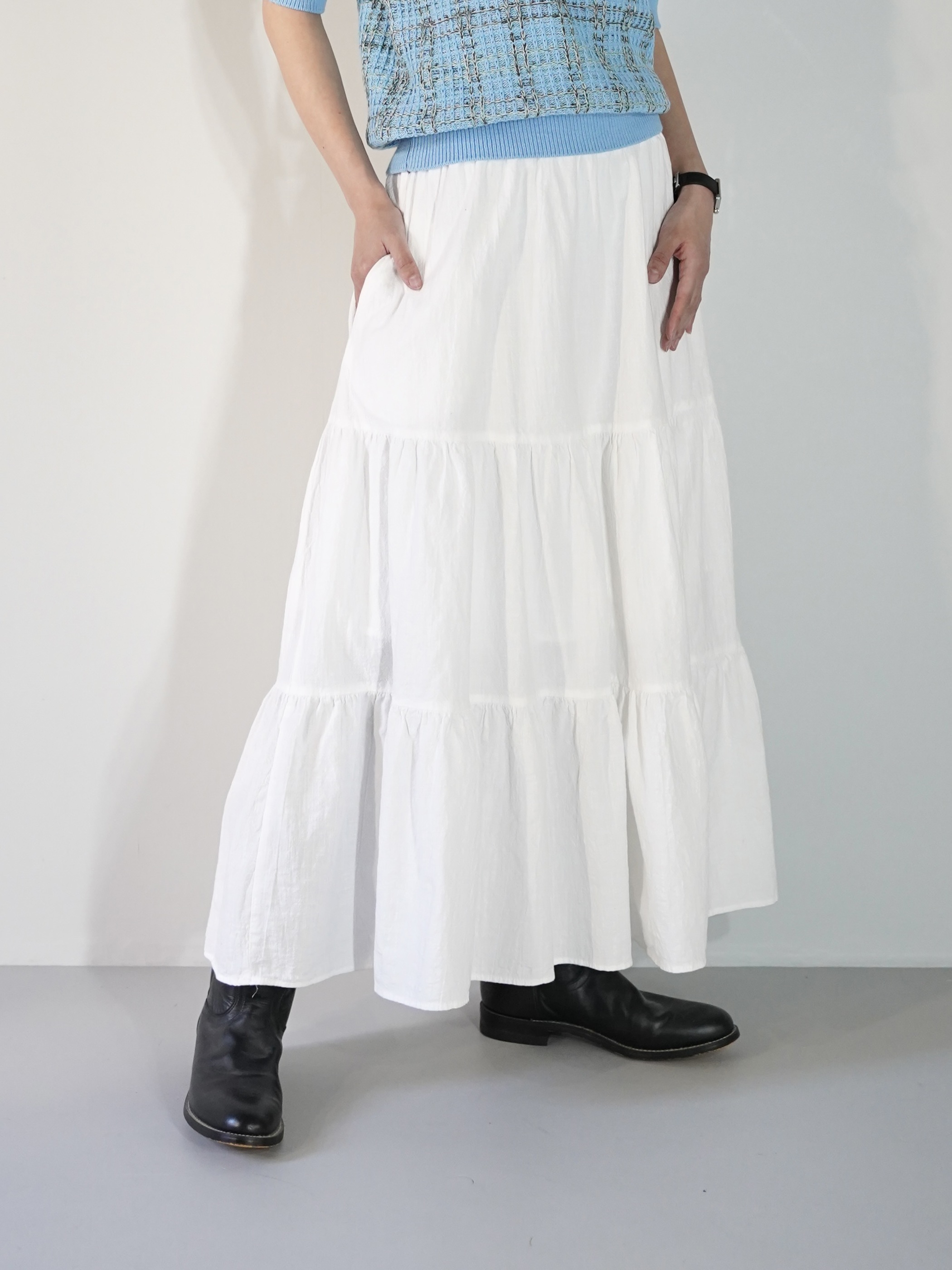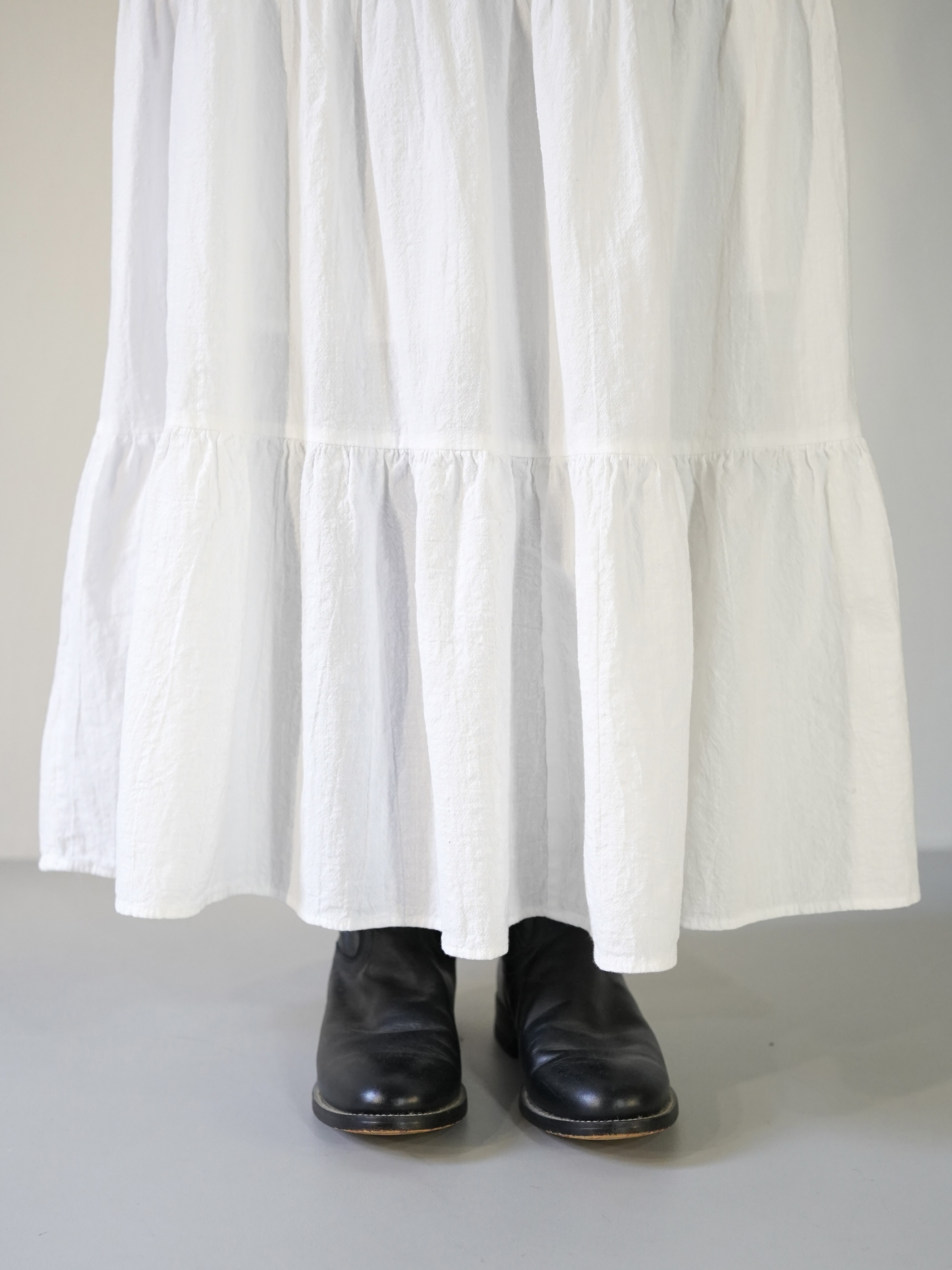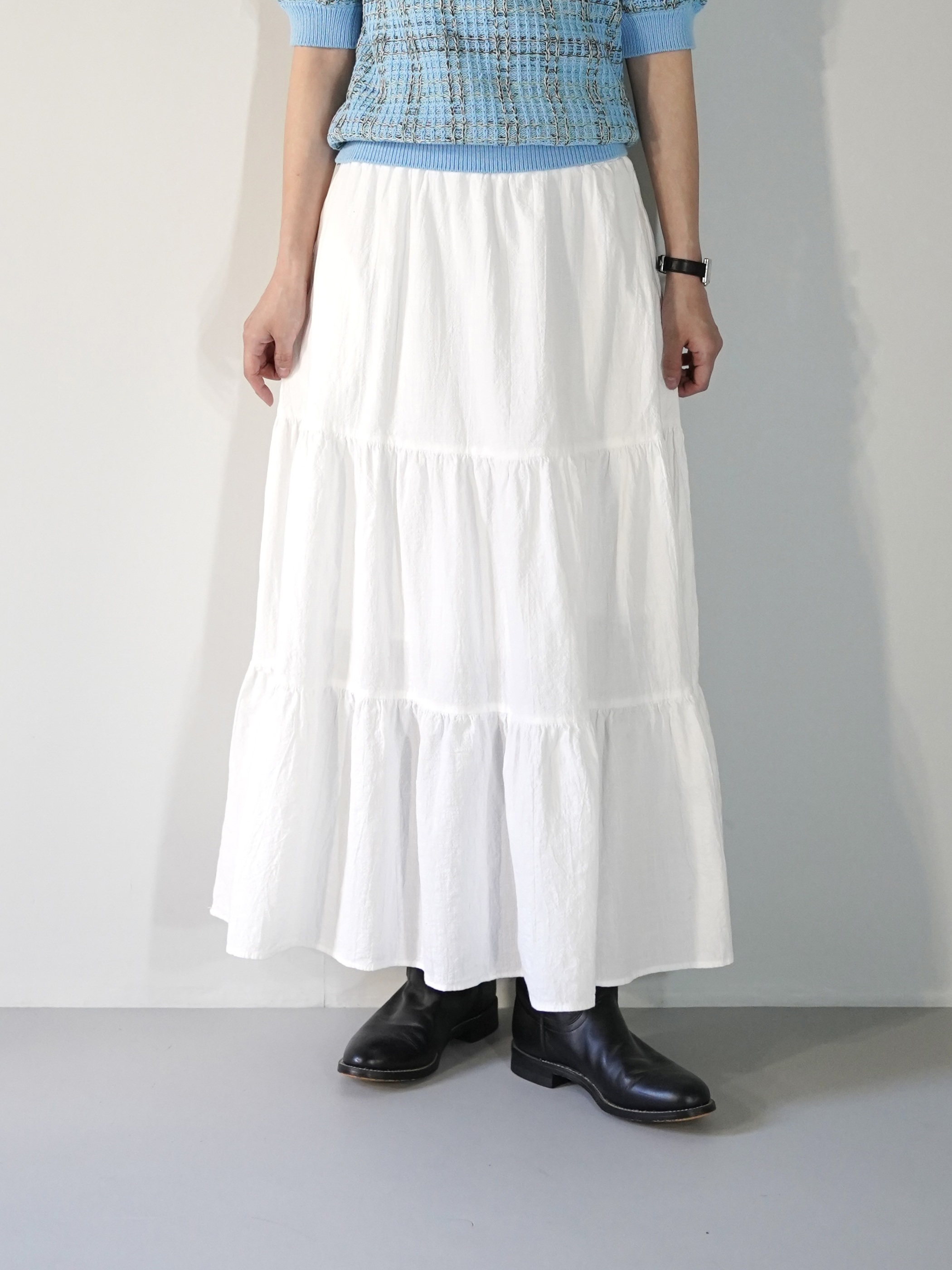 マキシまではいかない程の丈感で、ショートブーツやハイカットスニーカーなどハマるのでは無いかと思います