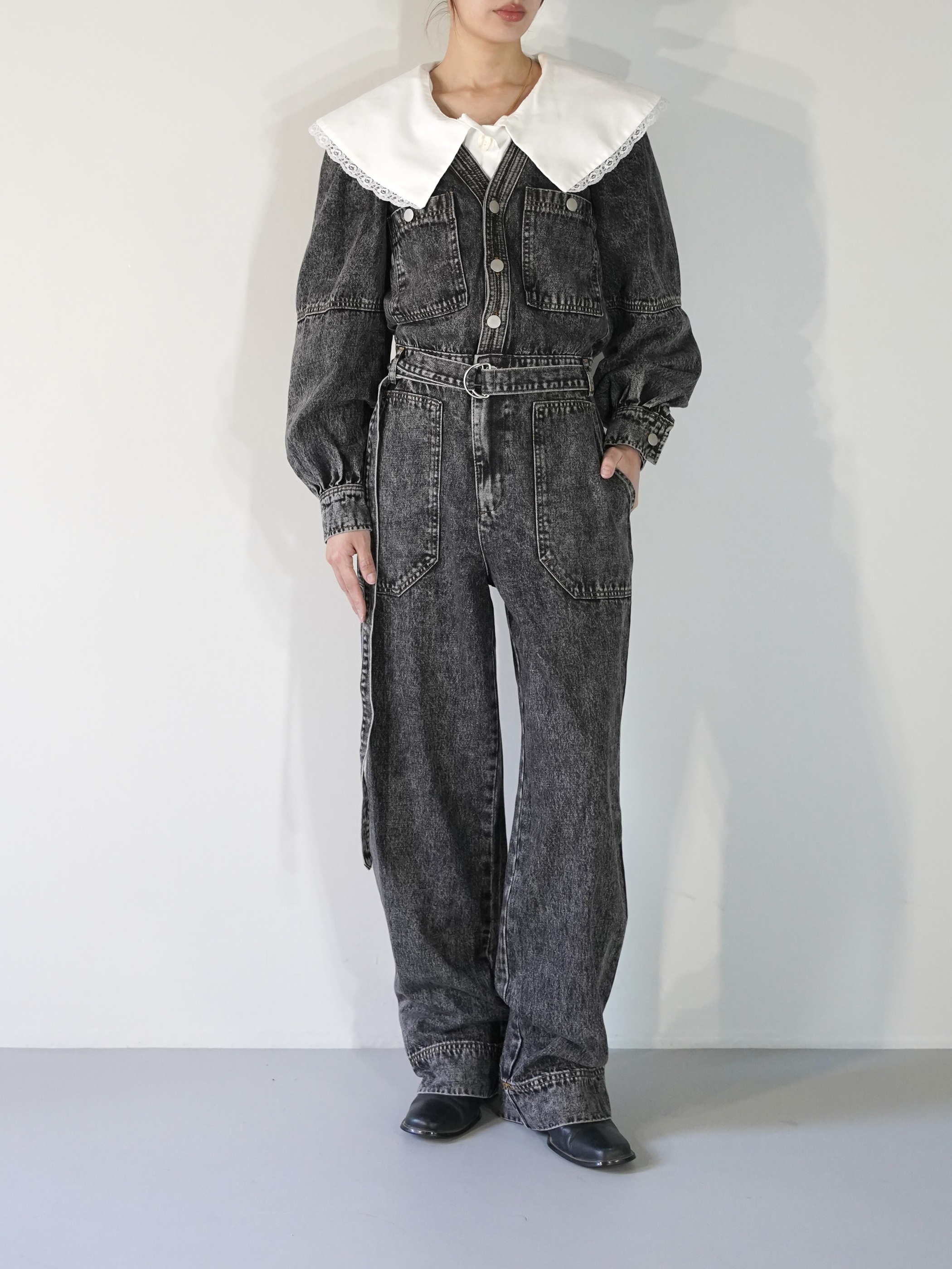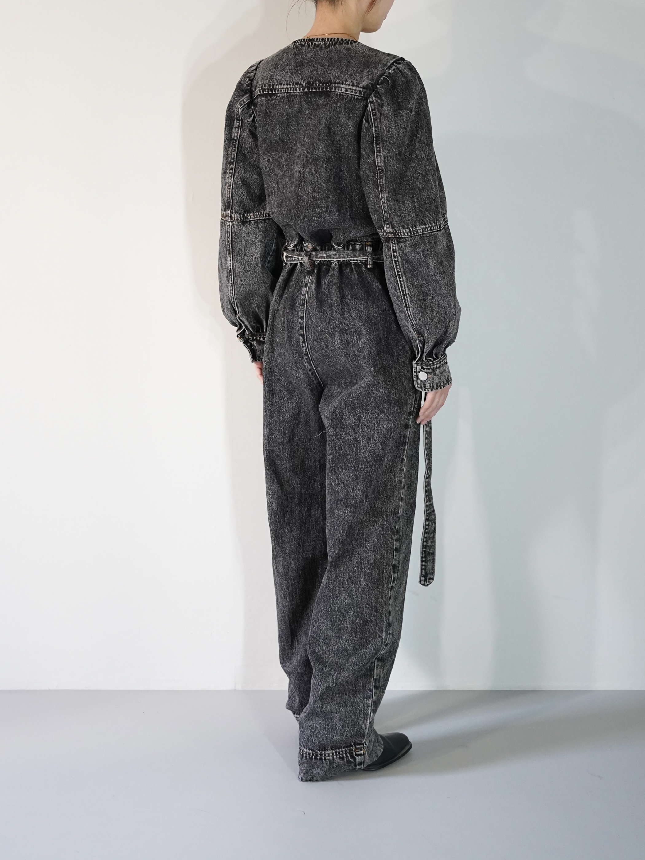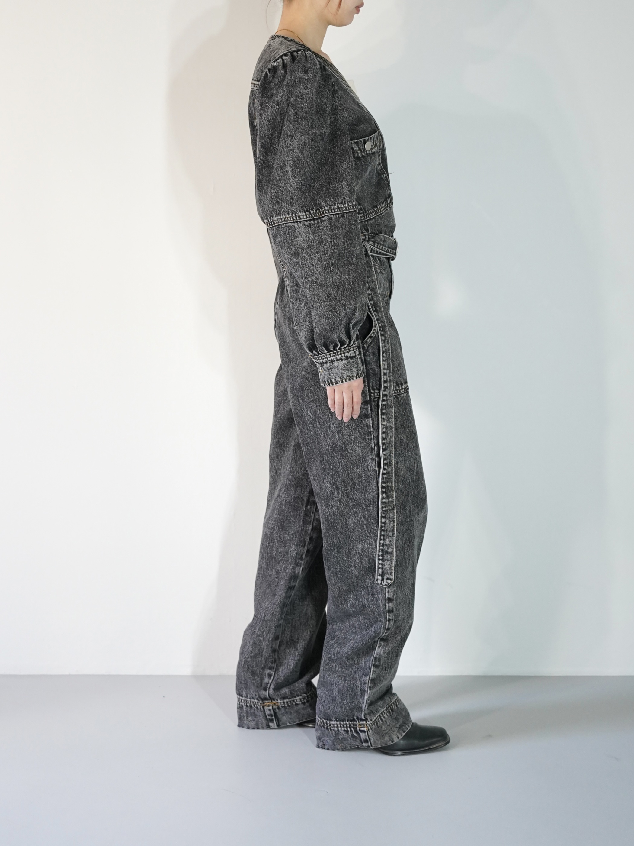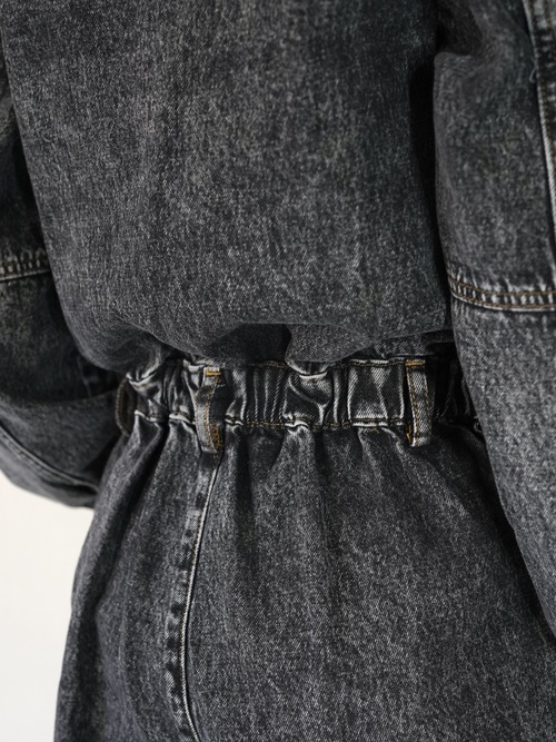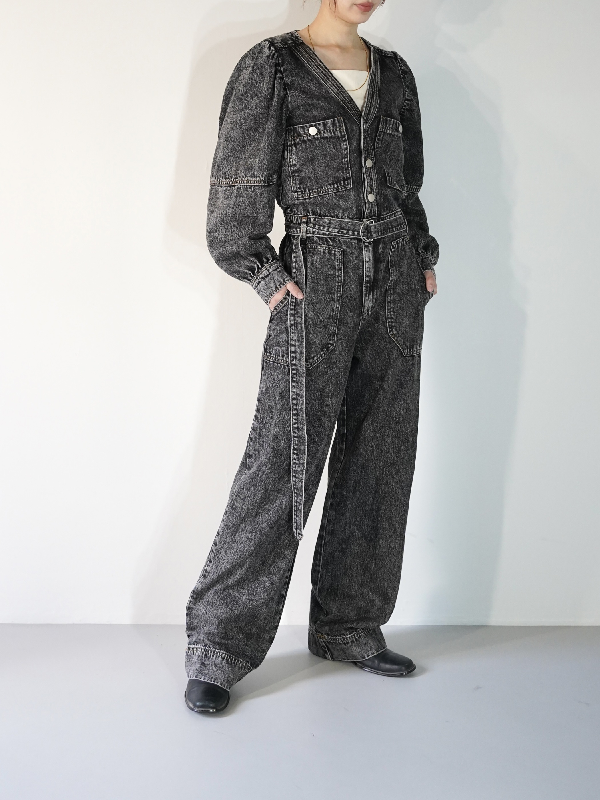 ストーンウォッシュ加工されたデニムジャンプスーツで胸元が大きく開いてレイヤードが楽しめます。