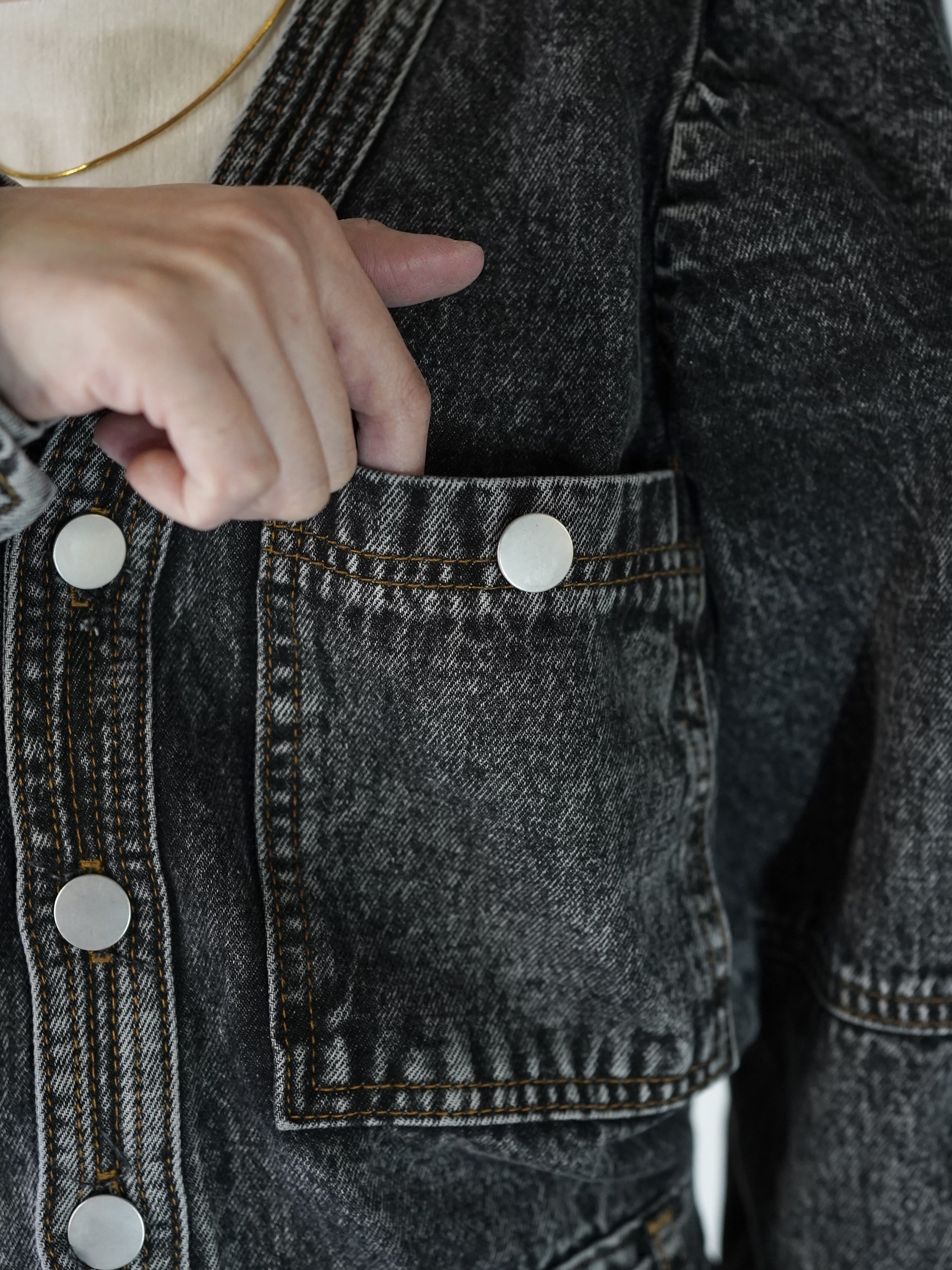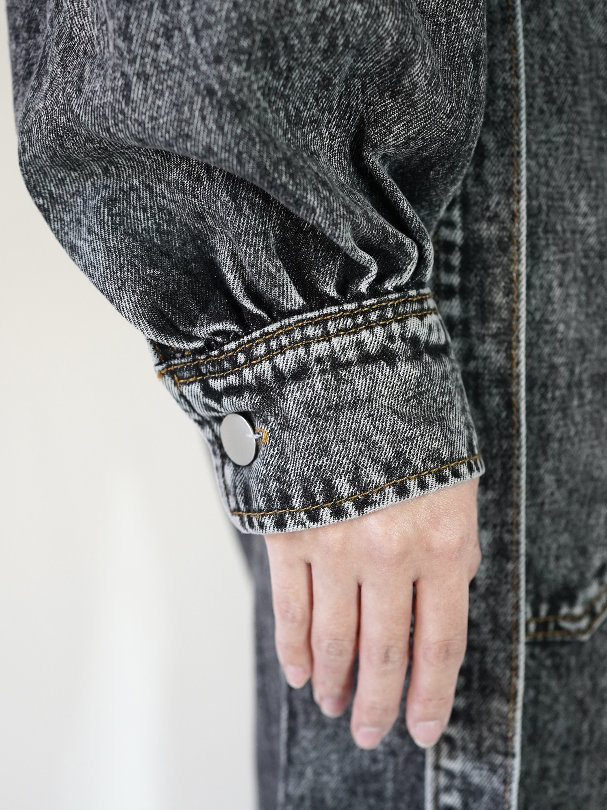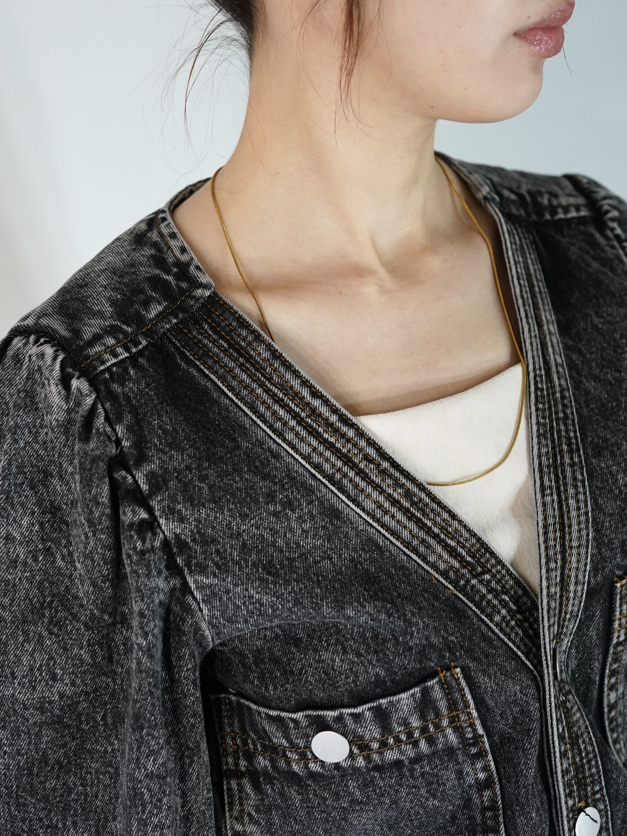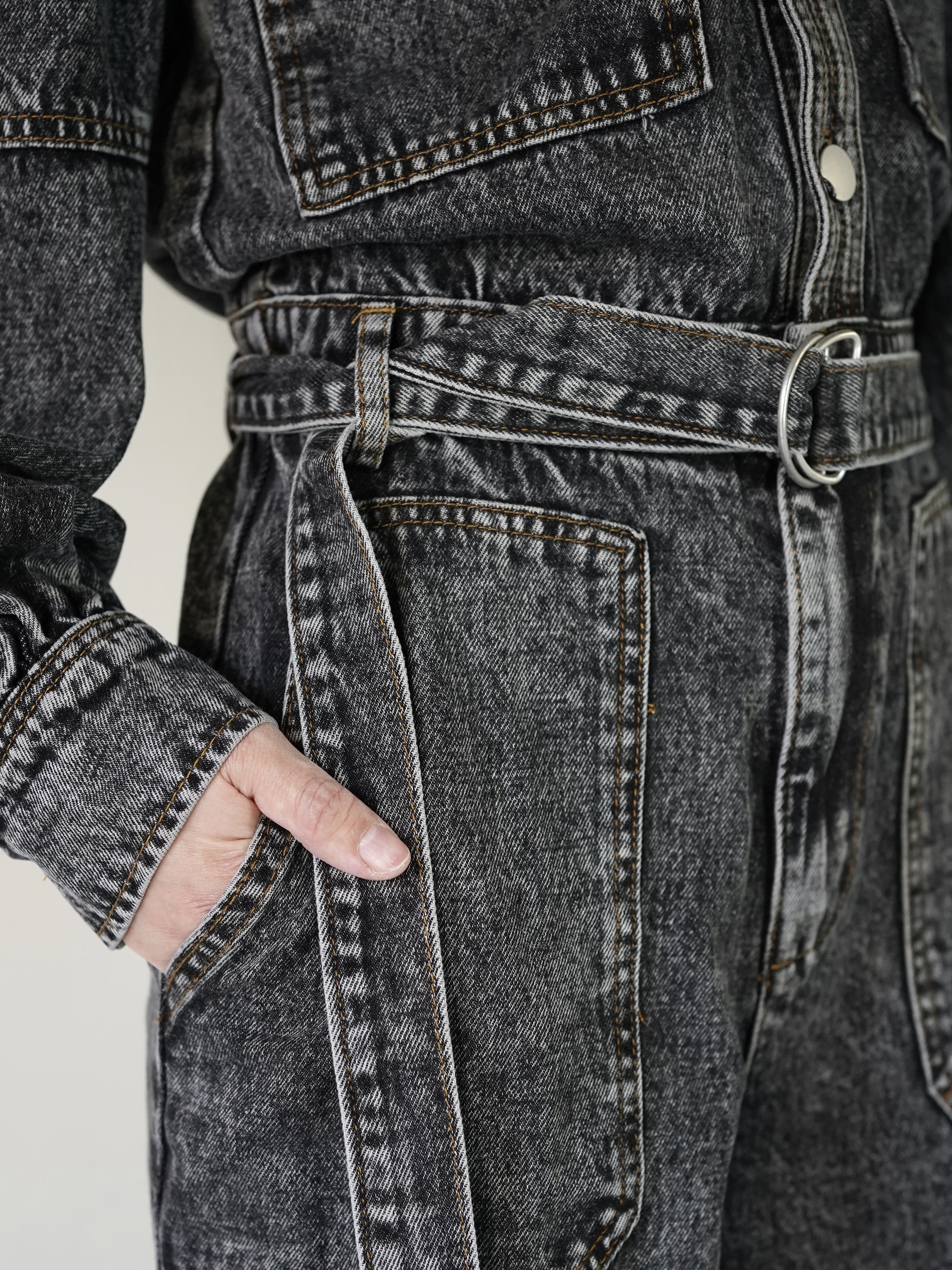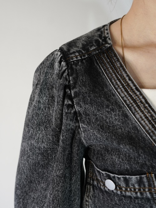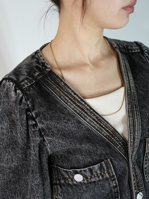 ストーンウォッシュ加工されたデニムジャンプスーツで胸元が大きく開いてレイヤードが楽しめます。