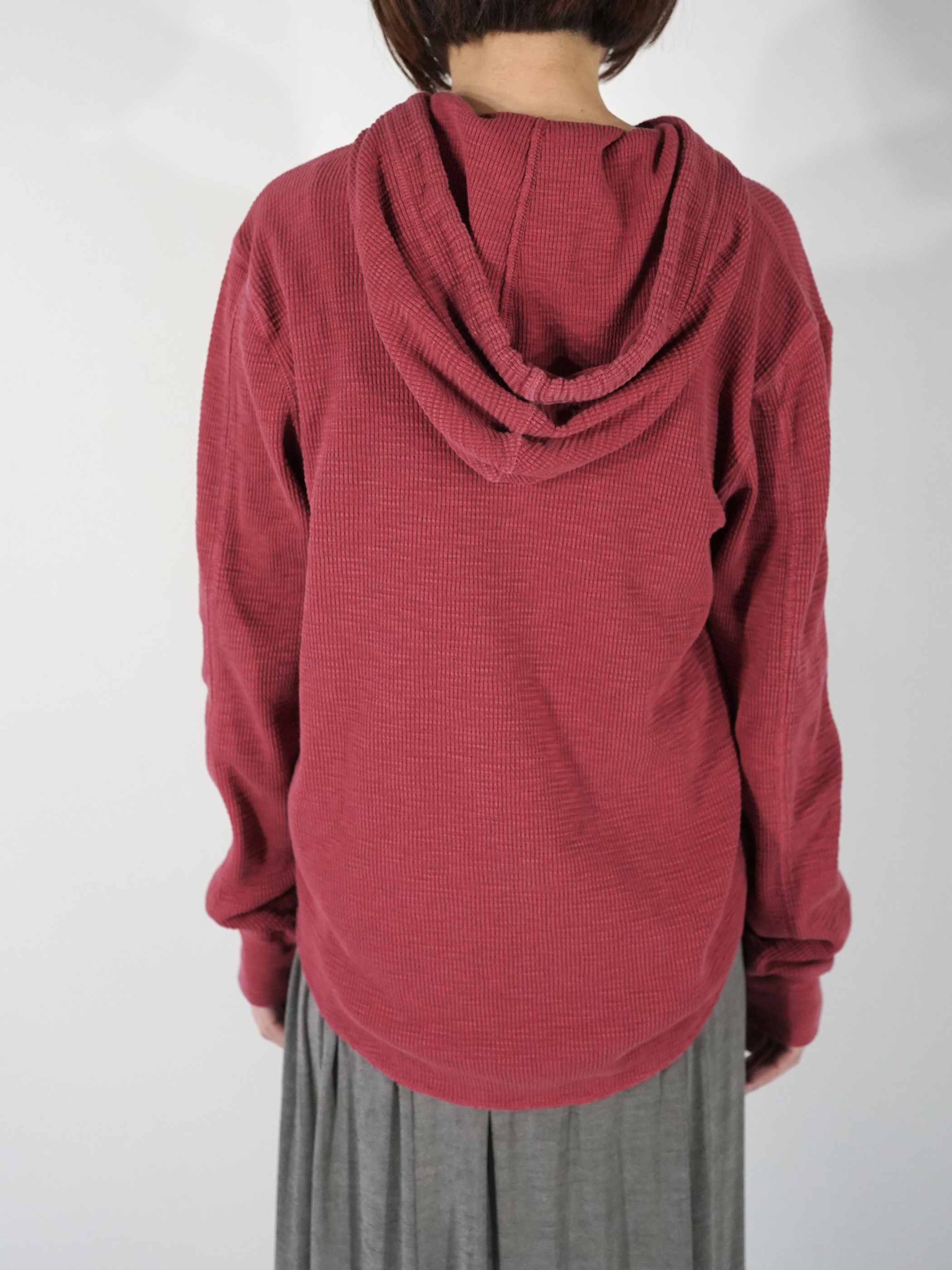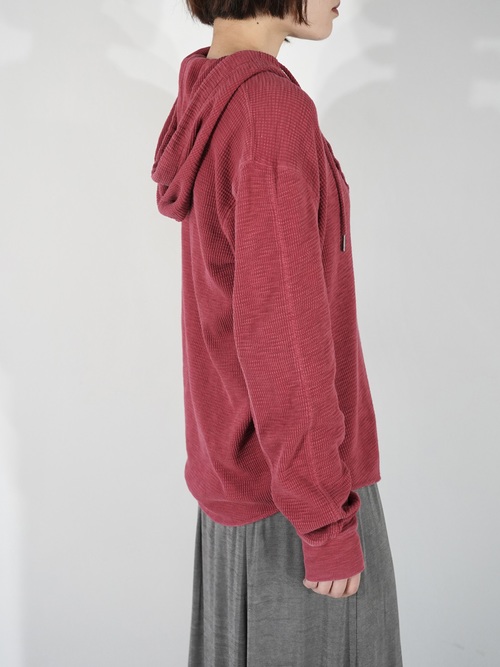 イチジク色の様なカラーリングに製品染めされたサーマルフーディー
