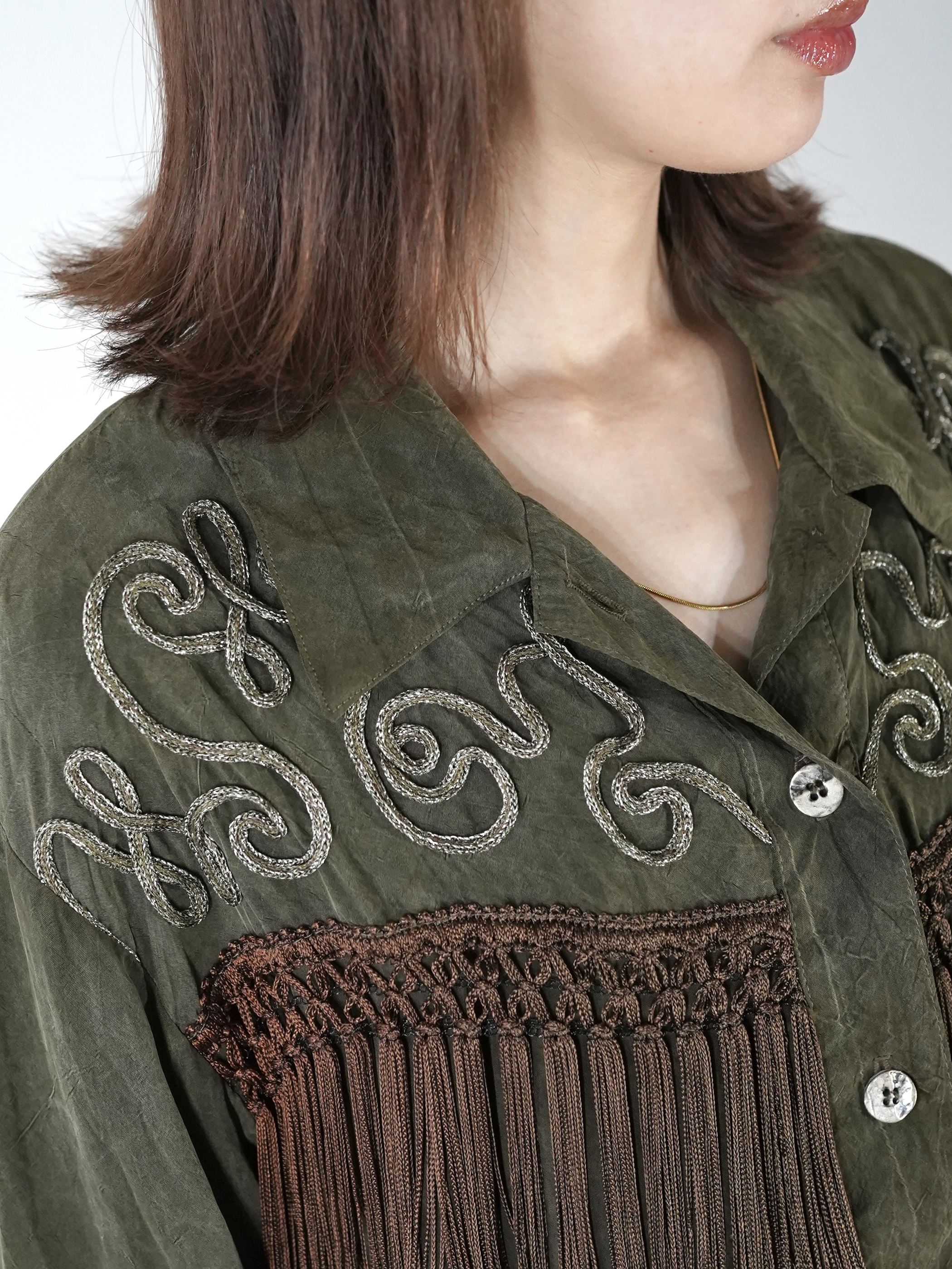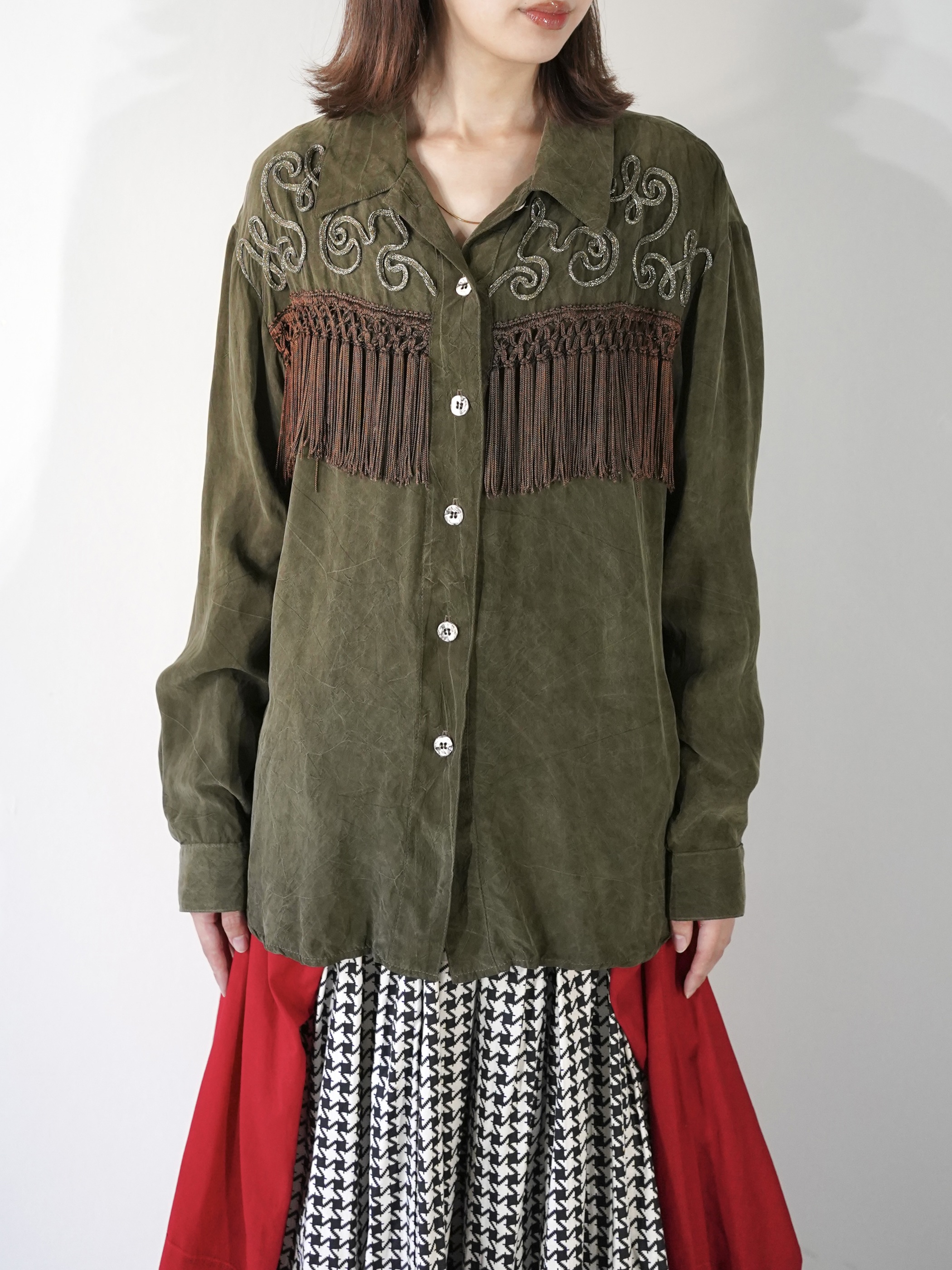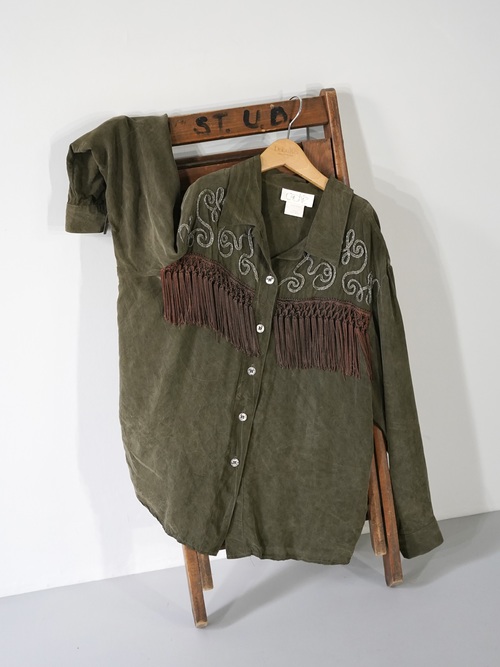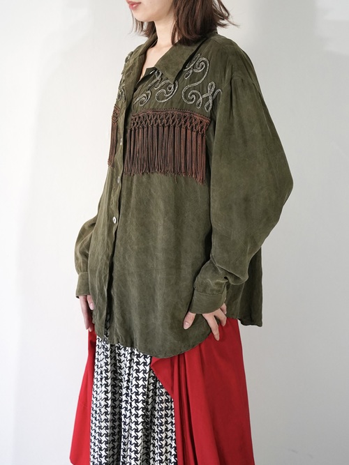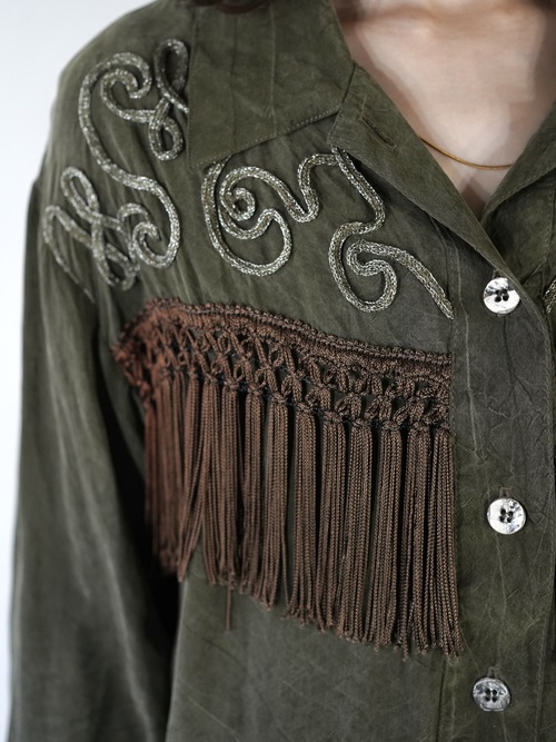 Vintageで散見されるシルクフリンジシャツとは異なり、Bodyの生地は全く別パーツを組み合わせて縫製、編み込みされたフリンジは繊細そのもの