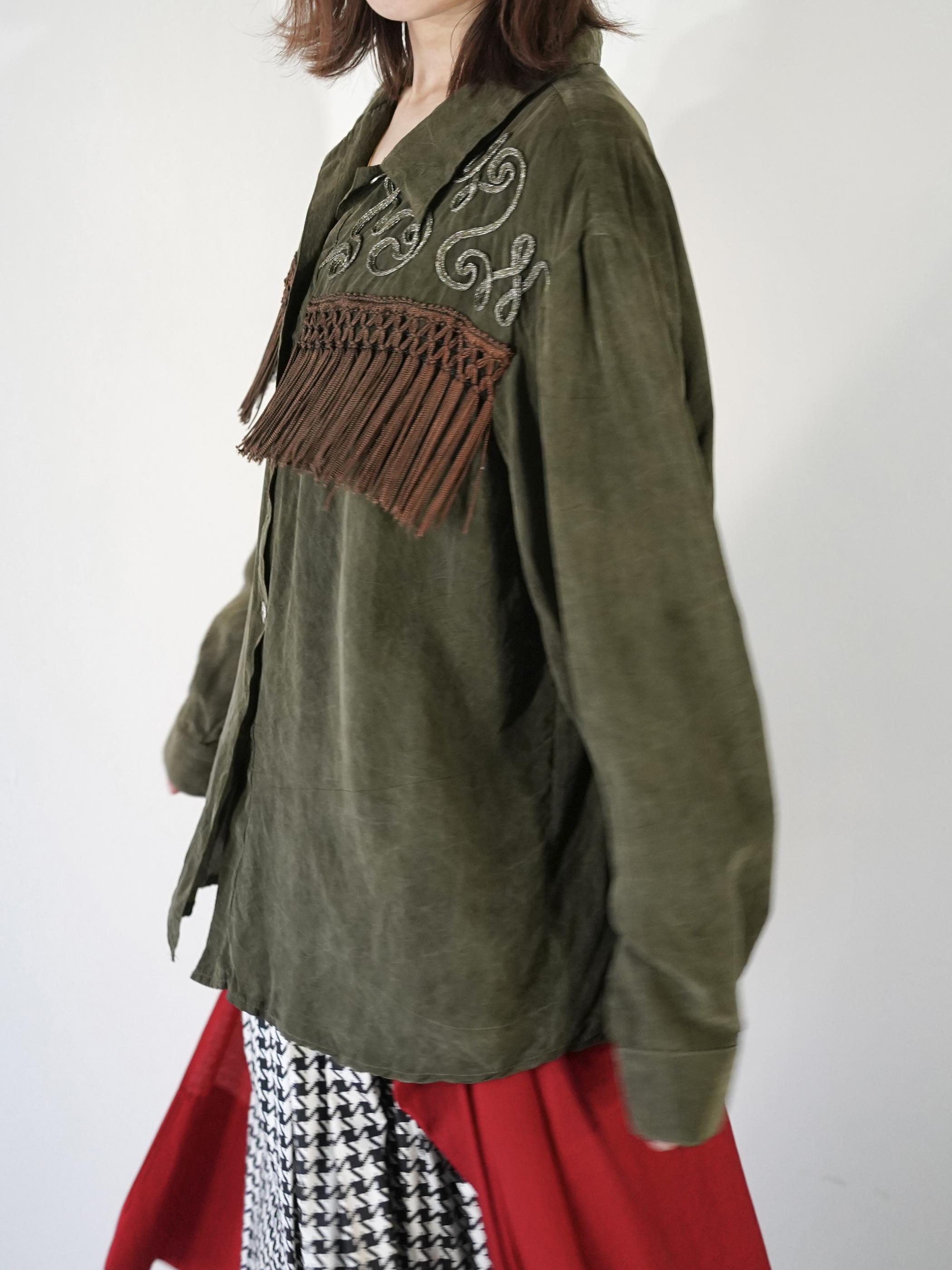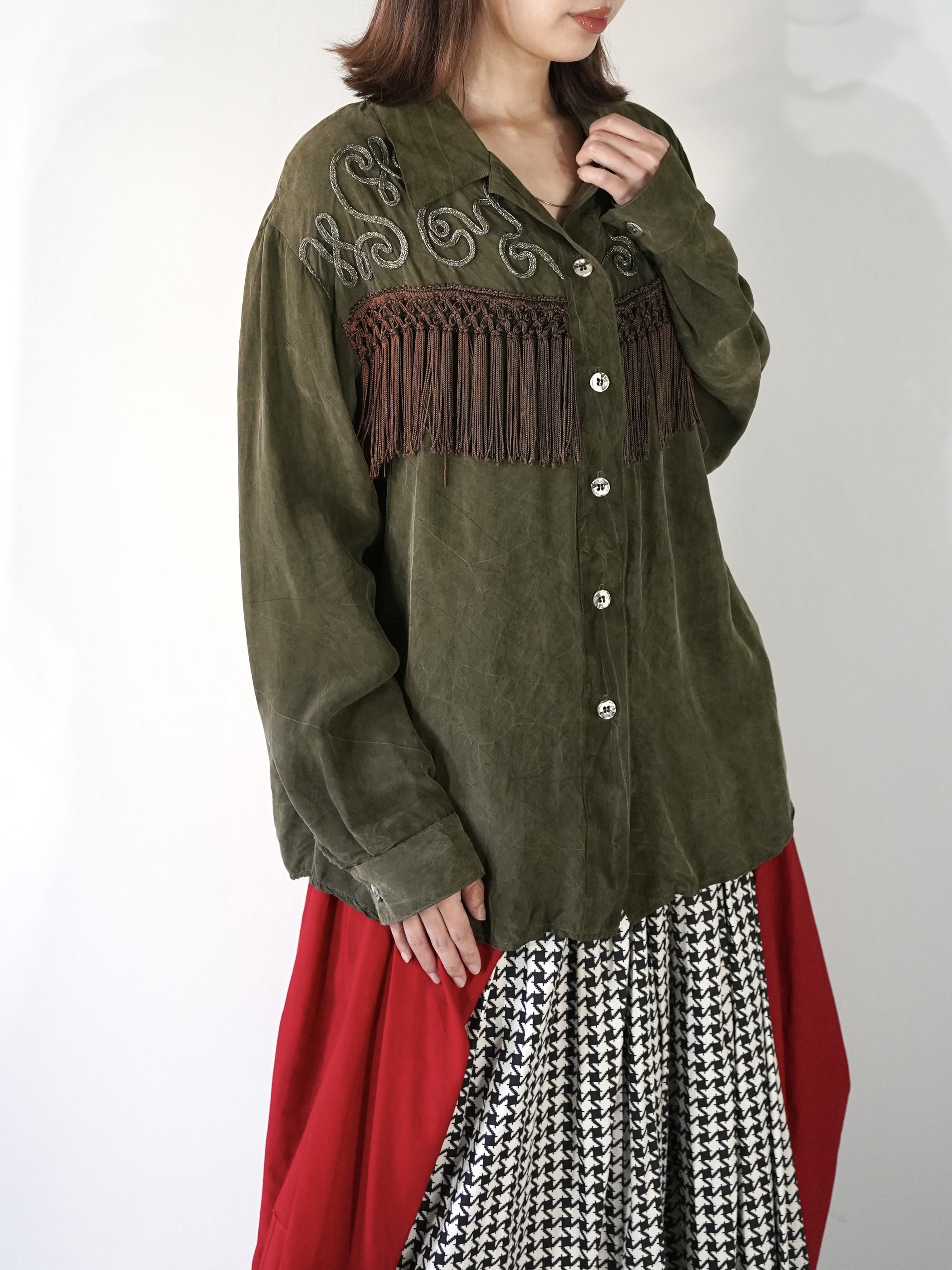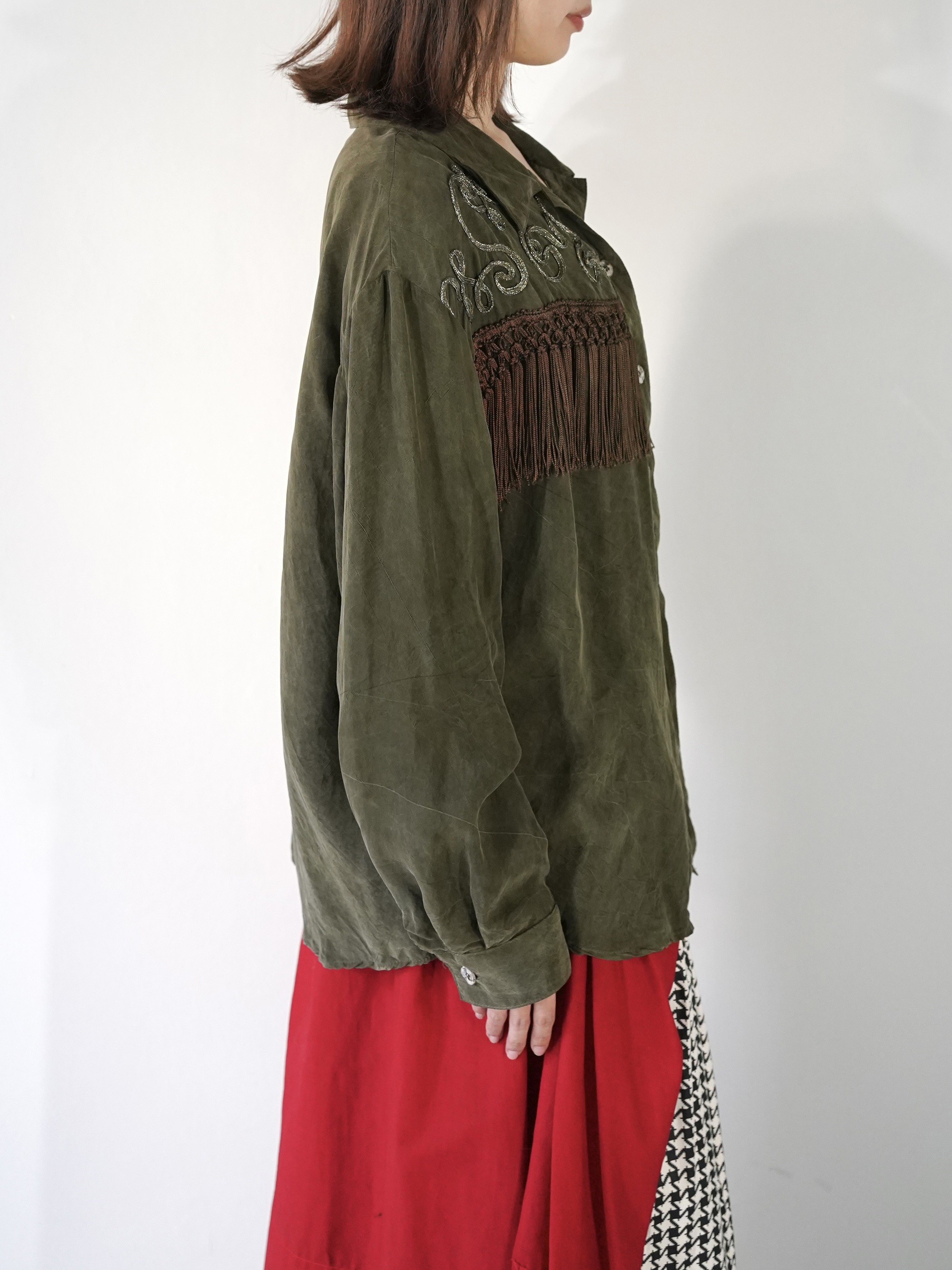 Vintageで散見されるシルクフリンジシャツとは異なり、Bodyの生地は全く別パーツを組み合わせて縫製、編み込みされたフリンジは繊細そのもの
