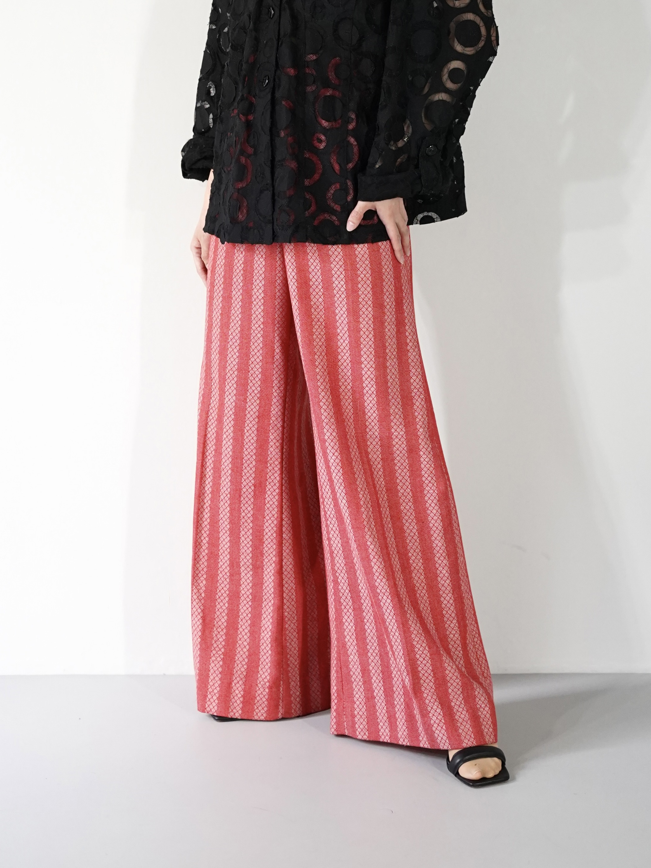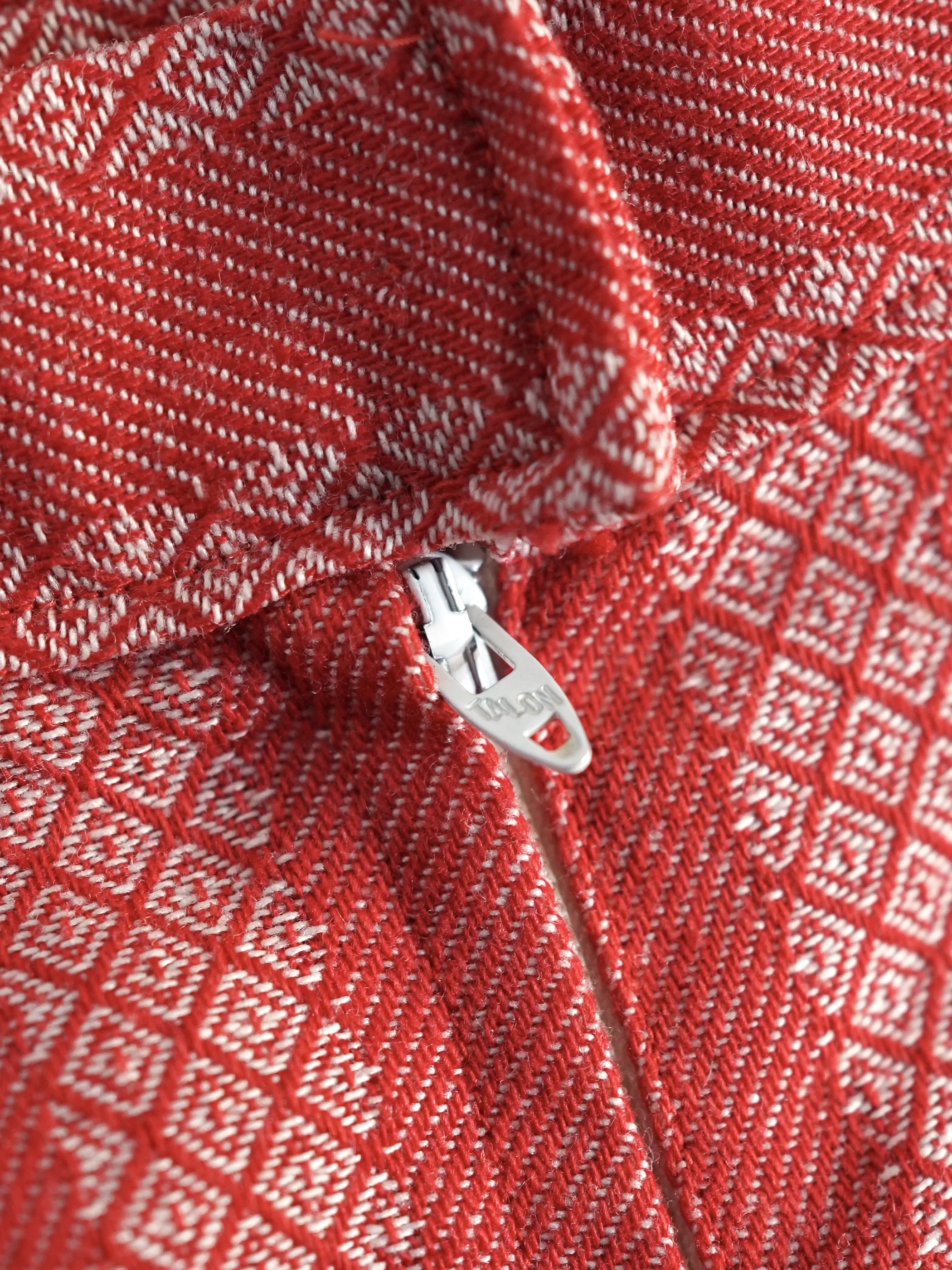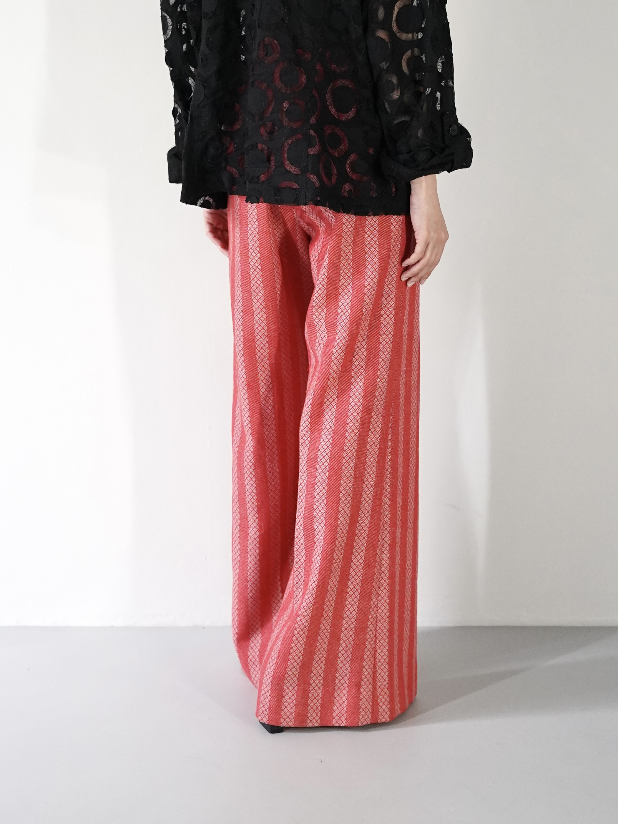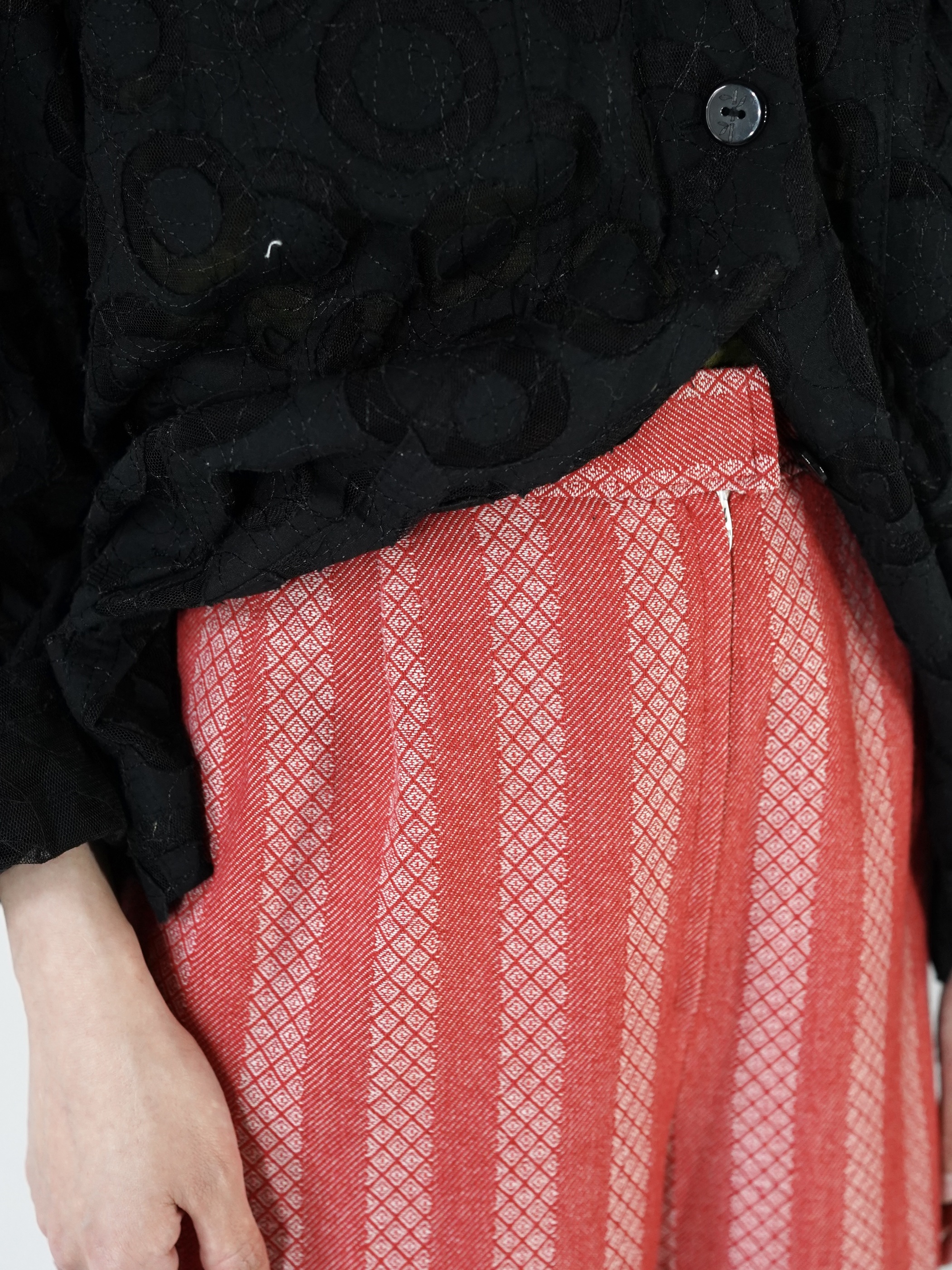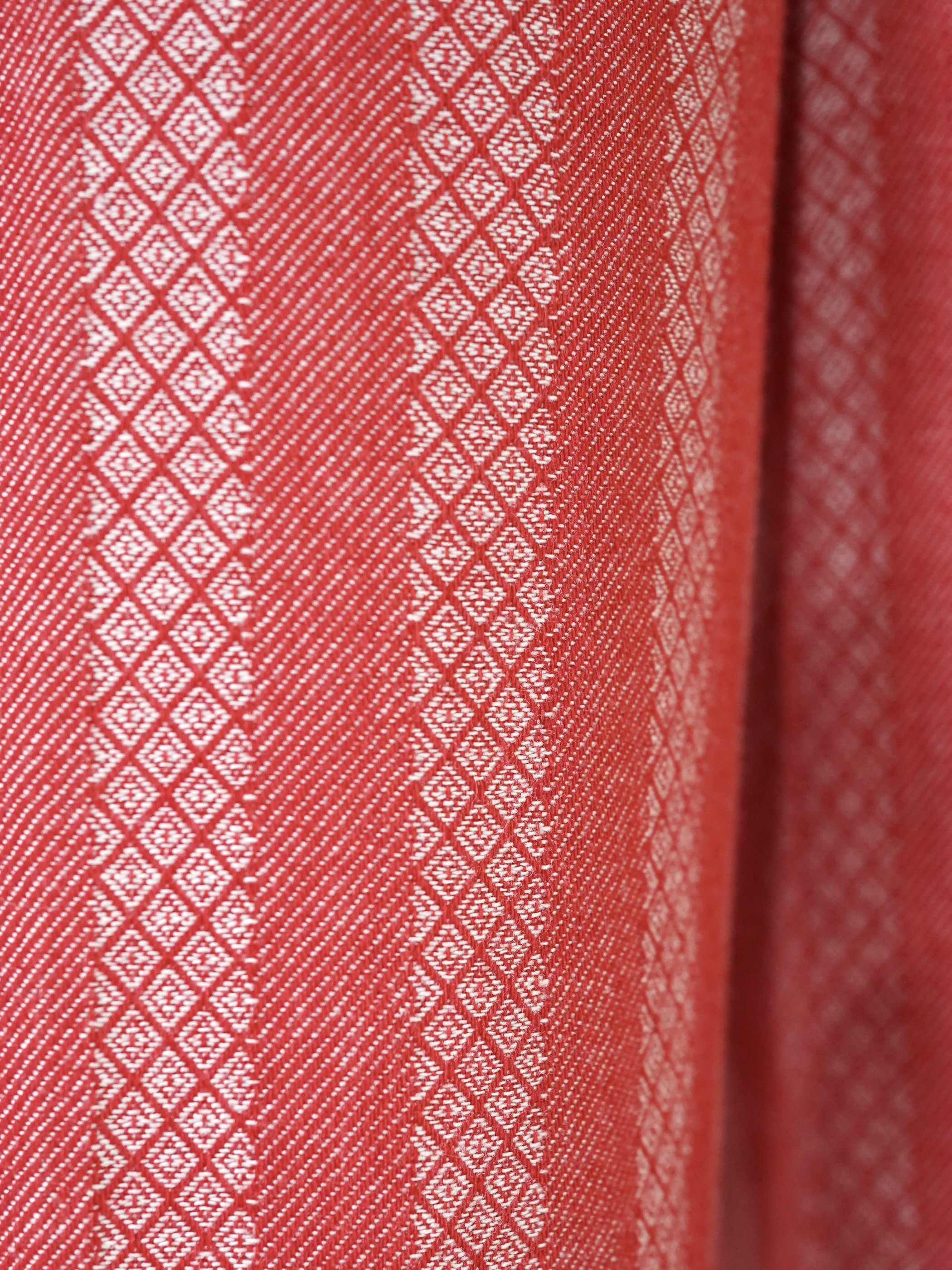 遠目にはストライプですが、近づくとサーモンレッドと白のストライプ柄。白の部分が繊細な織りをしたダイヤ模様で表現。
