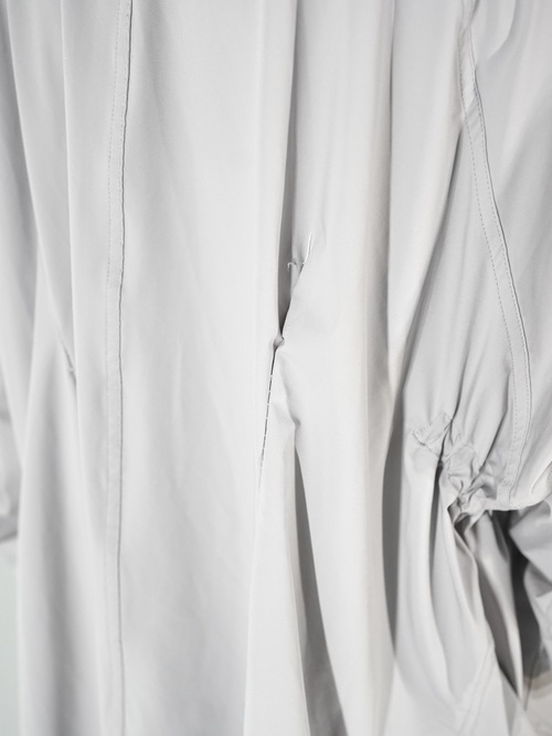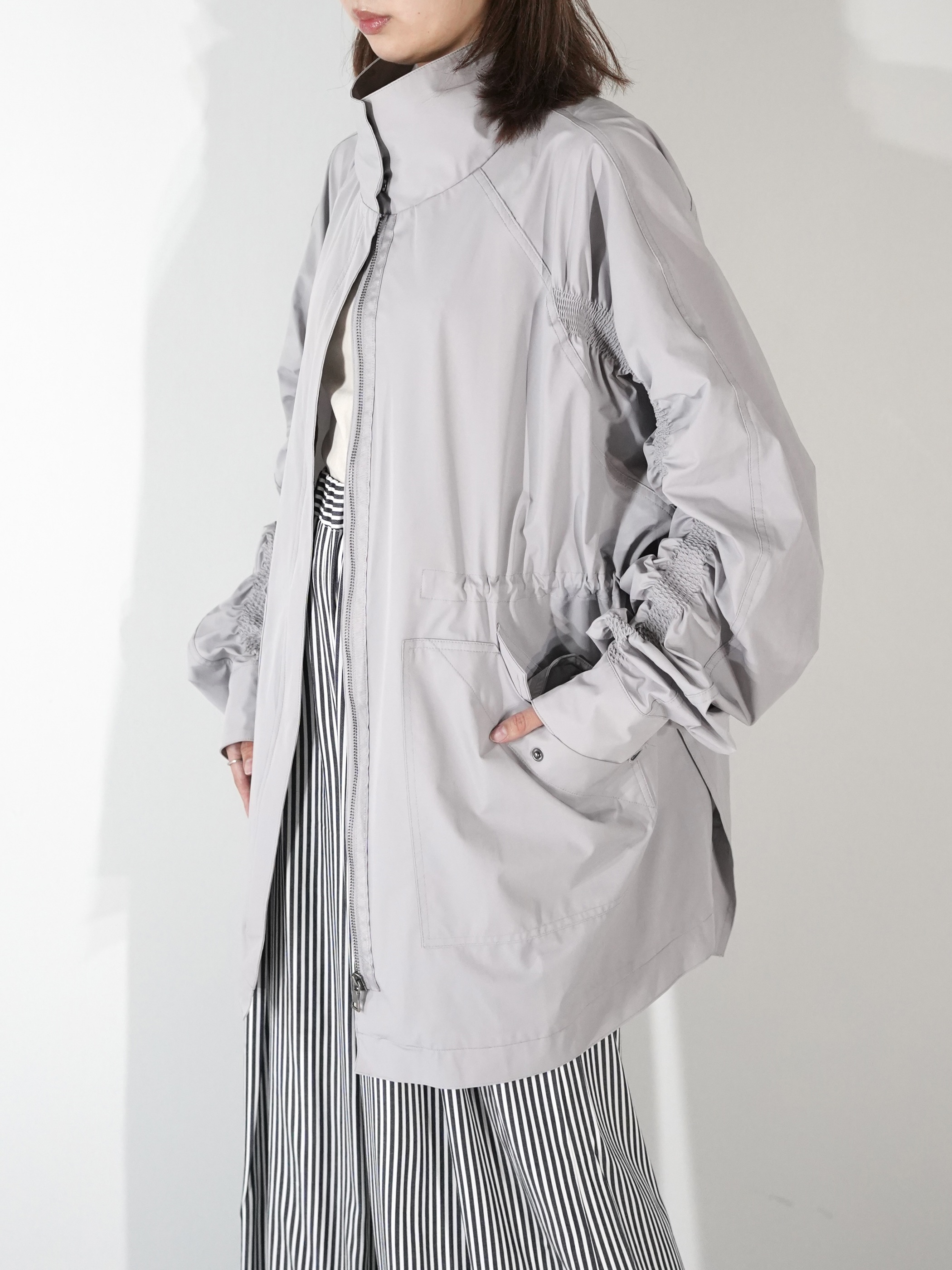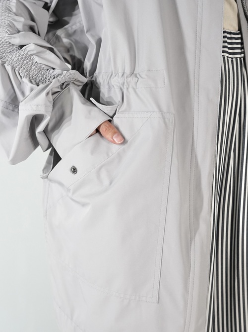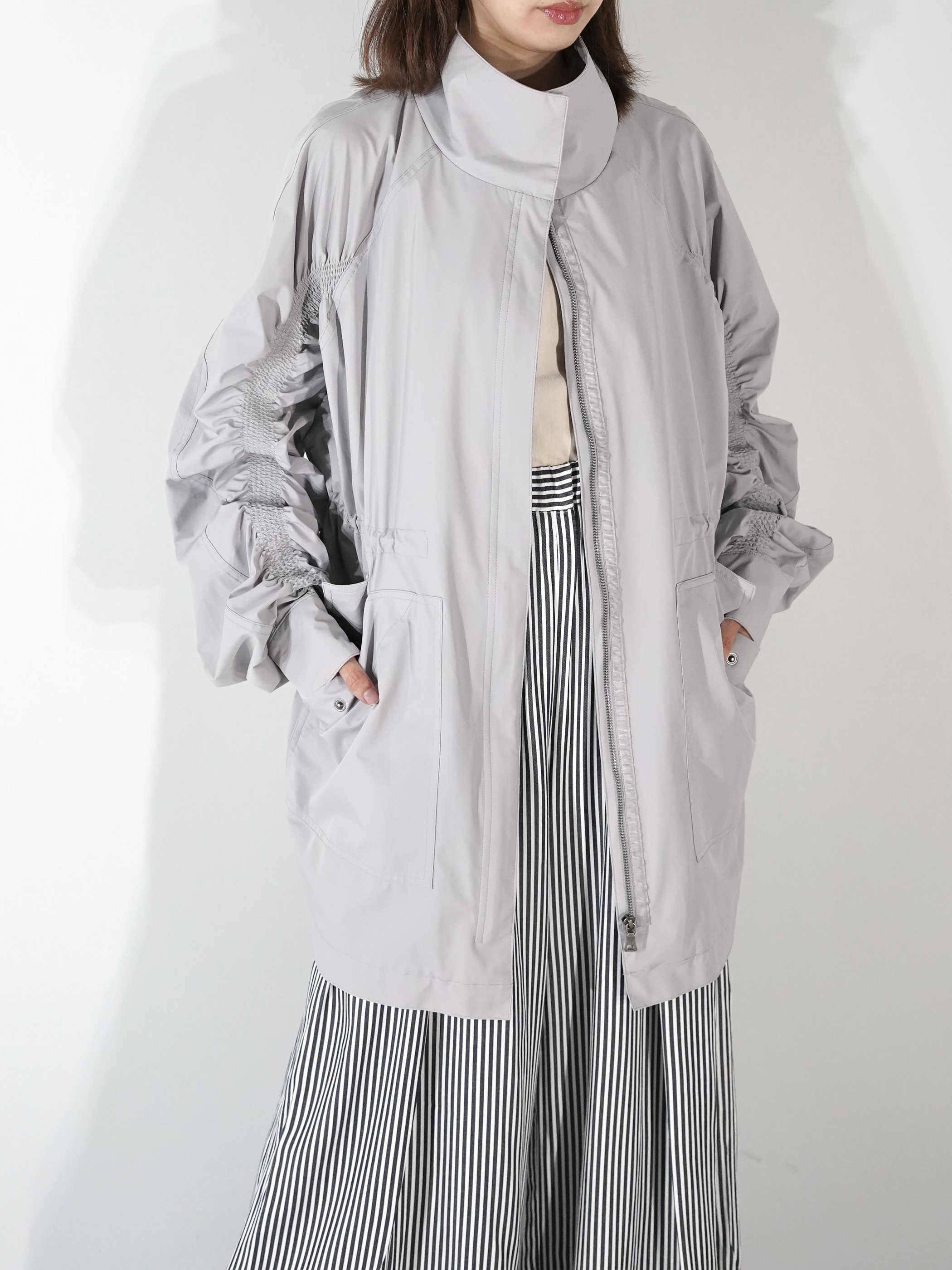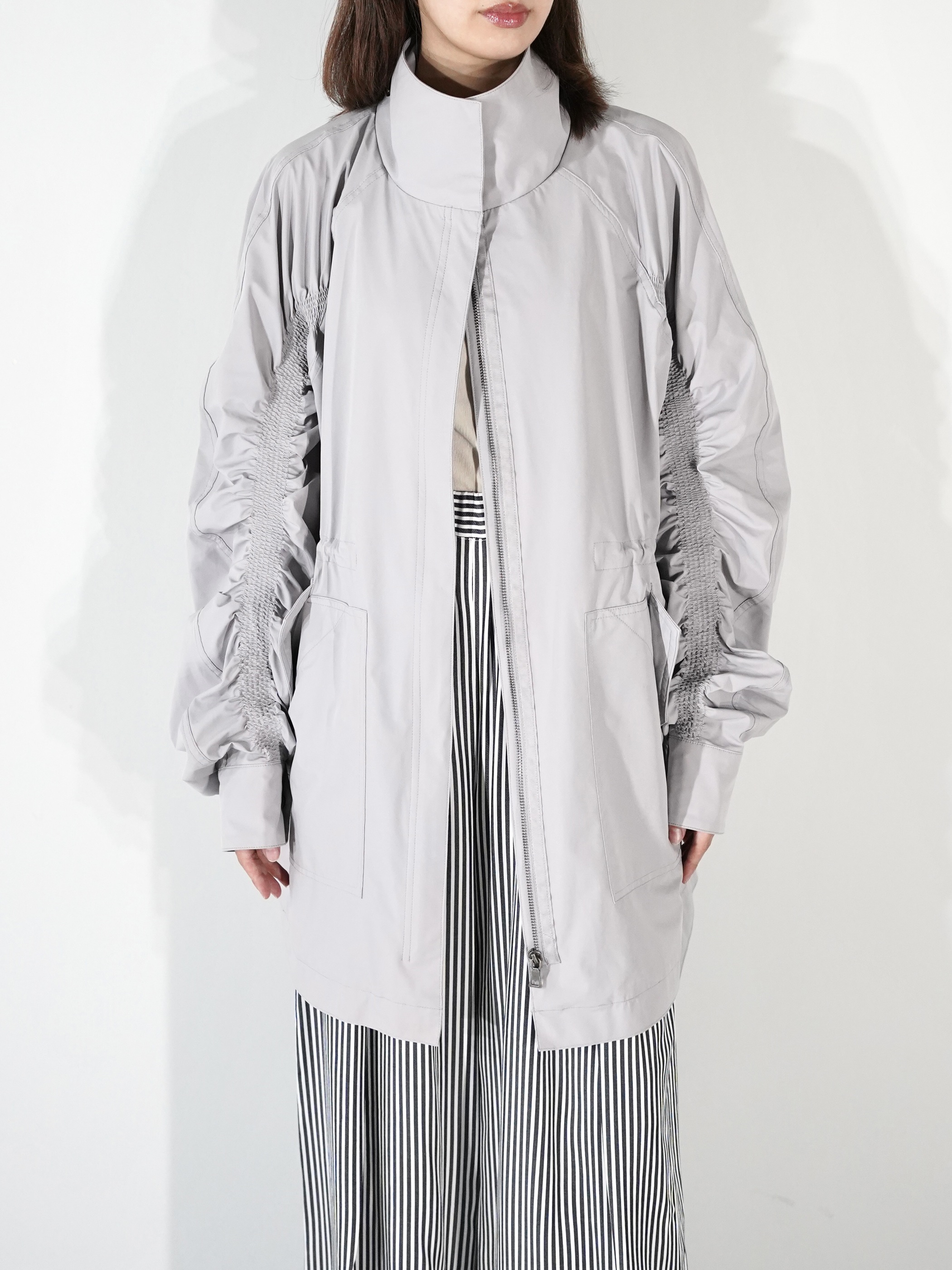 袖内側にシャーリングが施されギャザーとなったデザインの薄手ハーフコート
