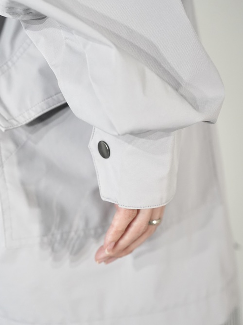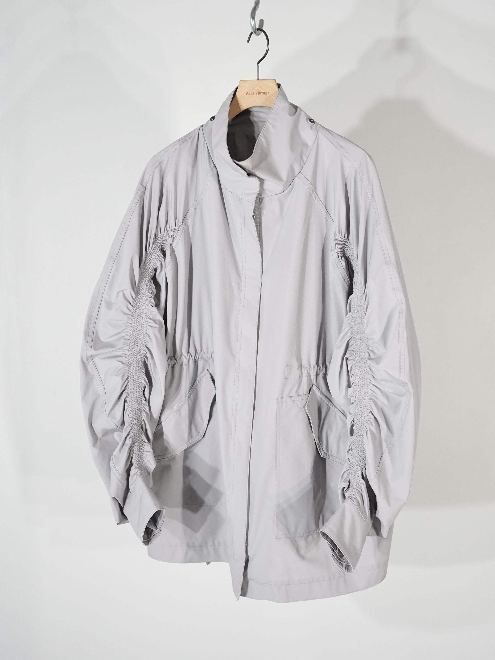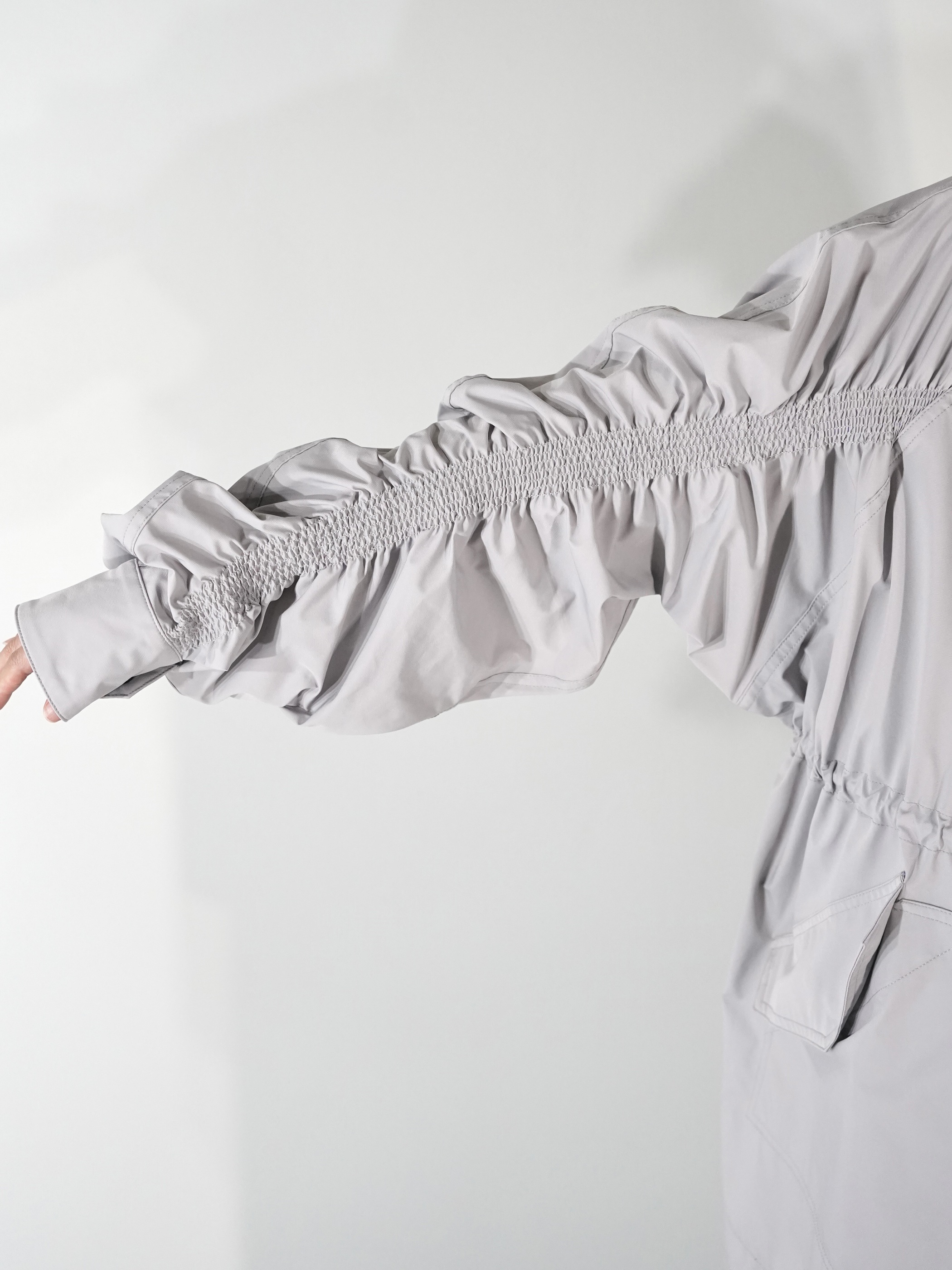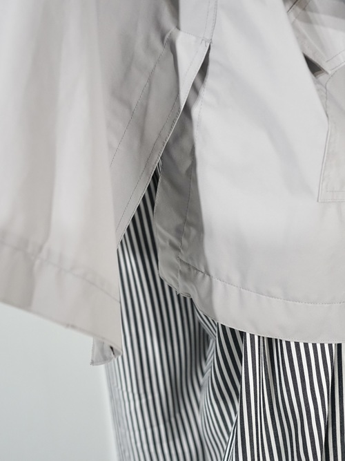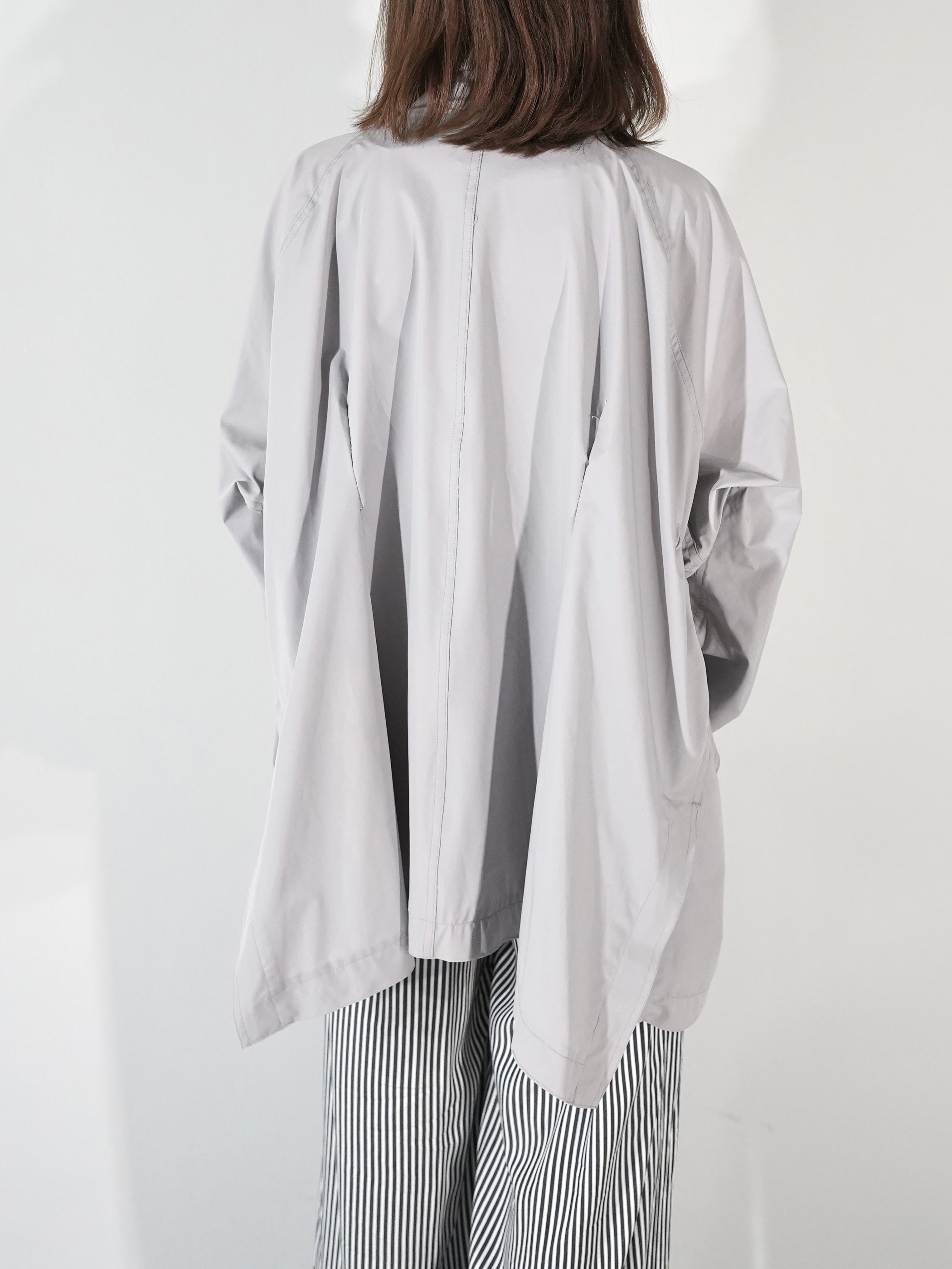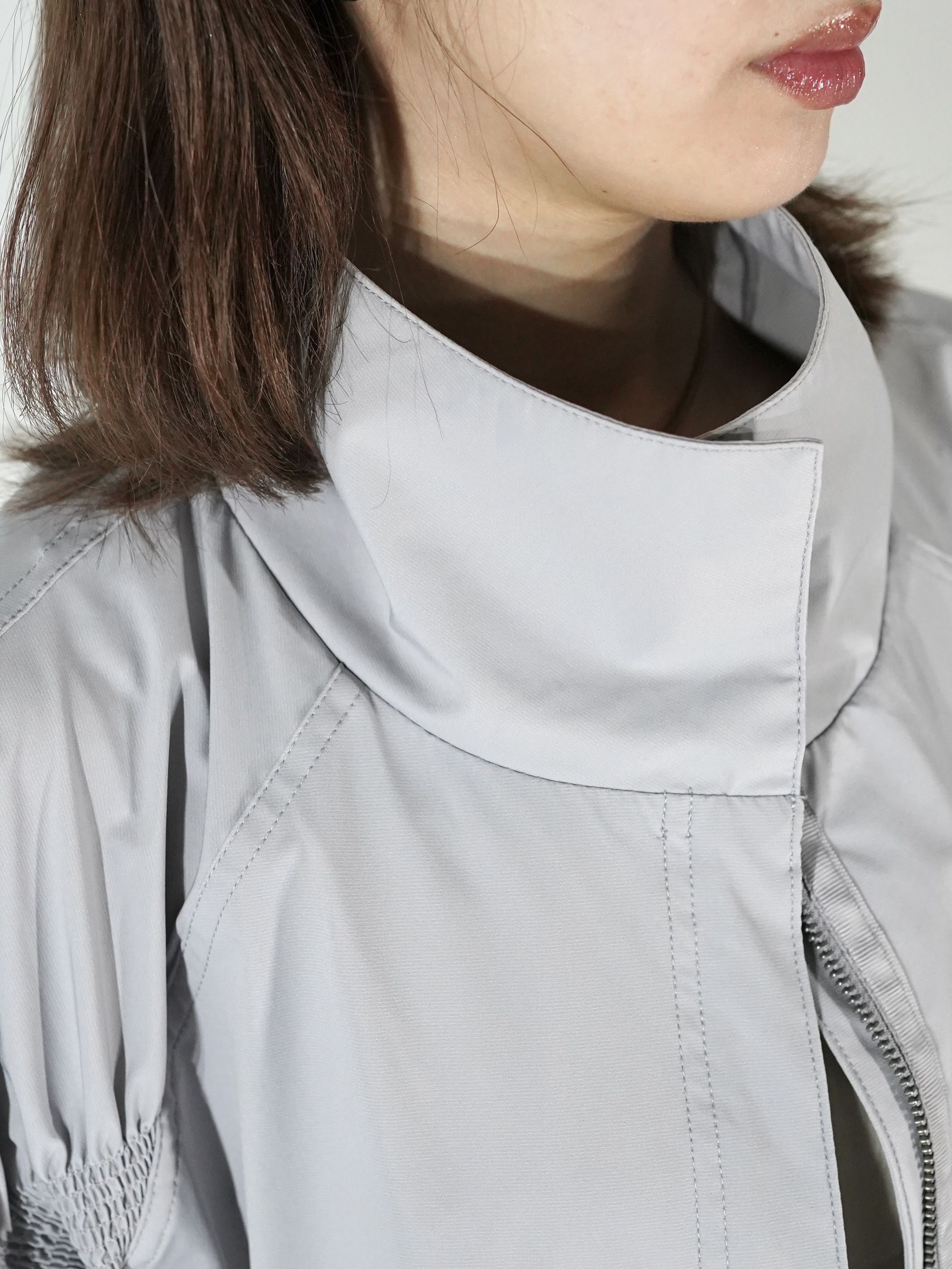 袖内側にシャーリングが施されギャザーとなったデザインの薄手ハーフコート